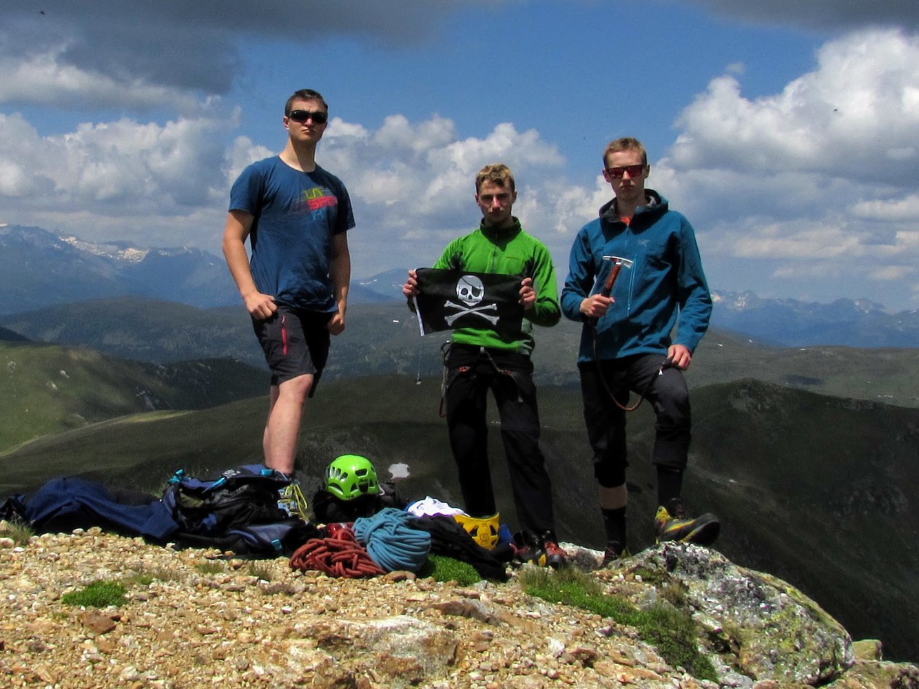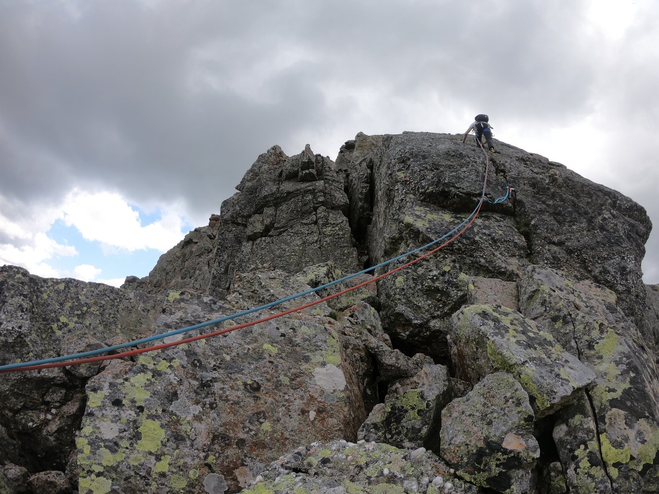- 3.SL: Kurz durch Blockfeld und dann rechts ueber angelehnte Platte mit zentralen grasbewachsenen Riss hinauf bis sich dieser abflacht und danach links des Faustrisses ueber Platte zu Gipfelplateau. Nach ausstieg ist ca. 10m leicht links ein Block bei dem man Stand machen kann.