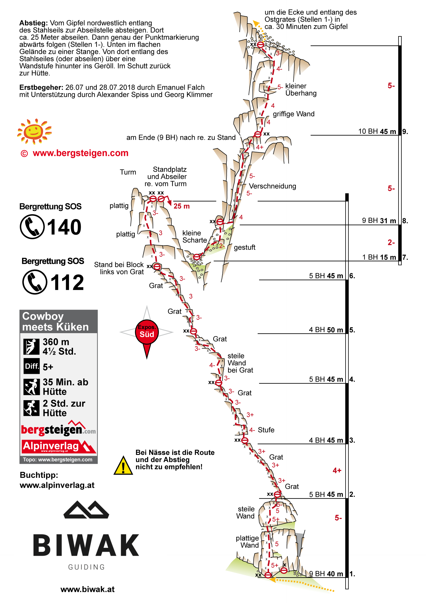 Vom Ende der Route um die Ecke und im Bereich des Ostgrates in ca. 30 Minuten hinauf zum Gipfel (Stellen 1-). Vom Gipfel nordwestlich entlang des Stahlseils zur Abseilstelle absteigen. Dort ca. 25 Meter abseilen. Dann genau der Punktmarkierung abwärts folgen (Stellen 1-). Unten im flachen Gelände zu einer Stange. Von dort entlang des Stahlseiles (oder abseilen) über eine Wandstufe hinunter ins Geröll. Im Schutt zurück zur Hütte.