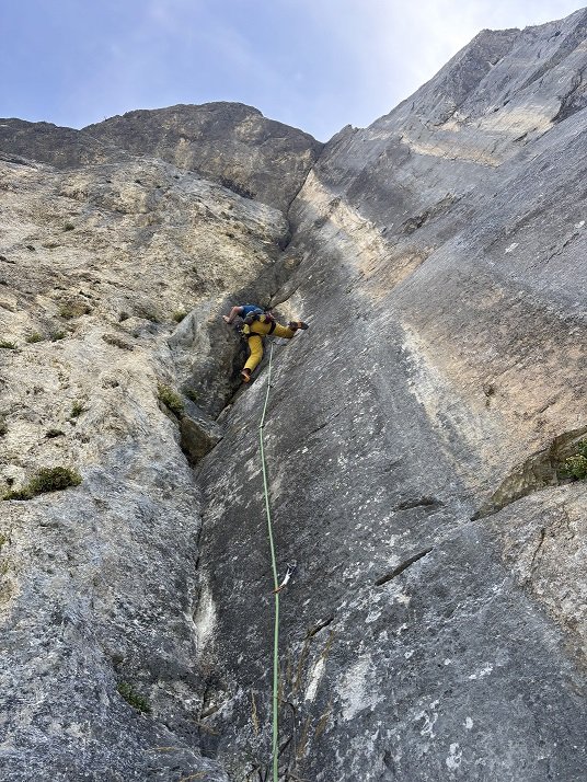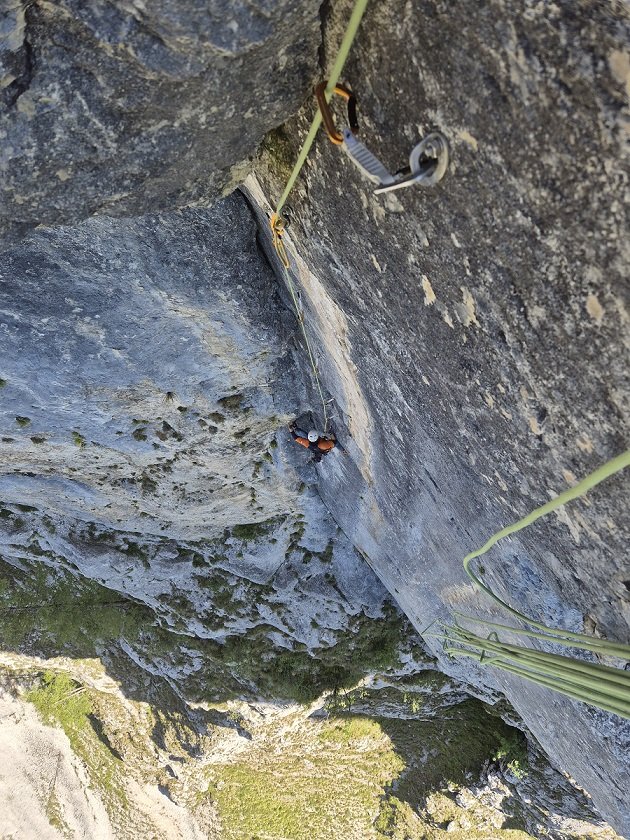3SL 8+ oder 7+A0 30 m das Herzstück der Tour und bereits von weiten sichtbar. 30 m Riss klemmen, schieben schrubben. Zuerst senkrecht empor, oben zieht der Riss nach rechts und es wird nochmal richtig steil.