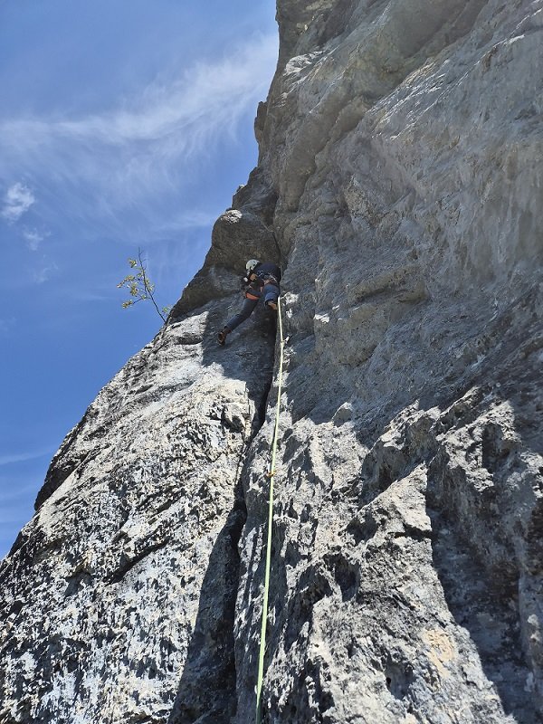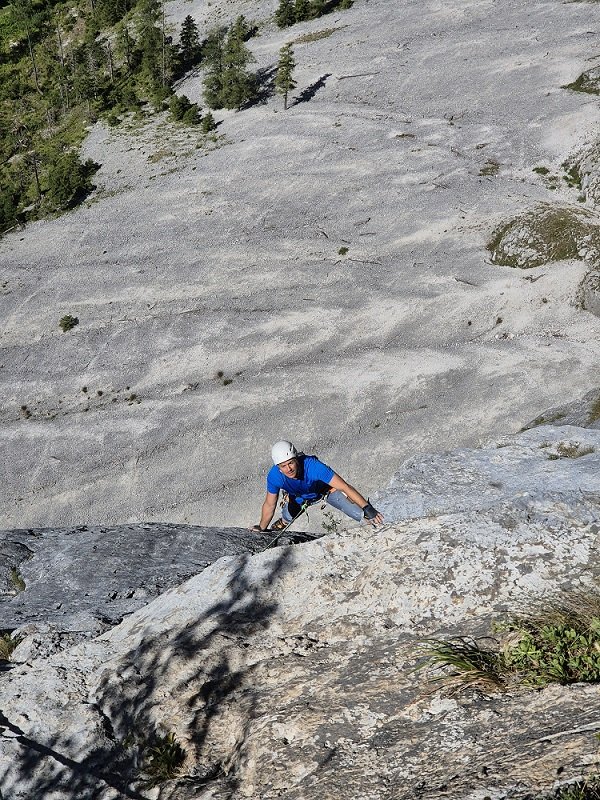 6SL 6/6+ 35 m zuerst Riss und Kamin bis zu einem kurzen brüchigen Überhang. Danach Schrofengelände bis zu Stand an Baum.