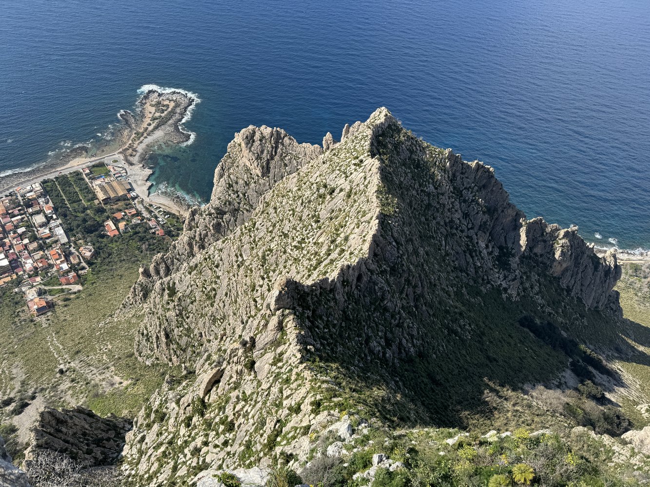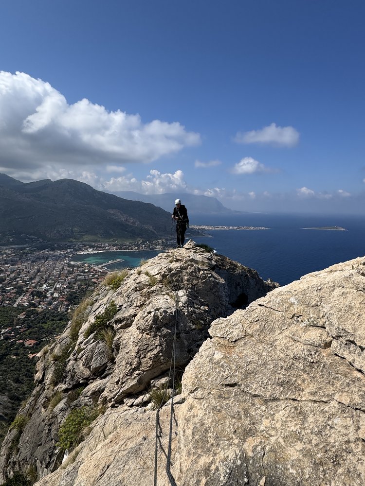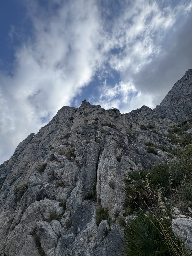 Vom Abseilstand den luftigen Grat weiter bis zu einen Pfeiler. Diesen rechts umrunden und über eine Wand wieder auf den Grat zu sichtbaren Stand. Weiter über den Grat zum nächsten und letzten Stand (Abstiegsmöglcihkeit nach rechts zum Einstieg der "Creste del Marco ruspante". Jetz etwas links des Grates über eine Rinne und Wand / Platte zum flacheren Teil des Grates. Den flacheren Abschnitt in auf und ab, luftig bs zu seinen Ende. Kurz vor dem Aufschwung kann man nach links absteigen. Vor dem Aufschwung quert man nach links in eine Rinne und gelangt auf den ersten Pfeilerkopf. Hier nochmal links über einen Riss (Bohrhaken) auf einen weiteren Absatz, wo sich die Wand richtig aufsteilt,.Hier leichts rechts, etwas berüchig, nach oben auf ein kleines Band (IV). Das Band nach links bis zu einen Normalhaken und im Zickzack nachoben, zu einer grünen Rinne, kurz vor der Rinne befindet sich noch ein Bohrhaken. Weiter über die botanische Rinne zu einer kleinen Felswand (Stand an einen kleinen Baum). Weiter nach rechts der Kante zu streben, die nach 30m flach in einen.Grat übergeht. Den Ziegenspuren folgen, über leichtes Klettergelände zum Gipfel.