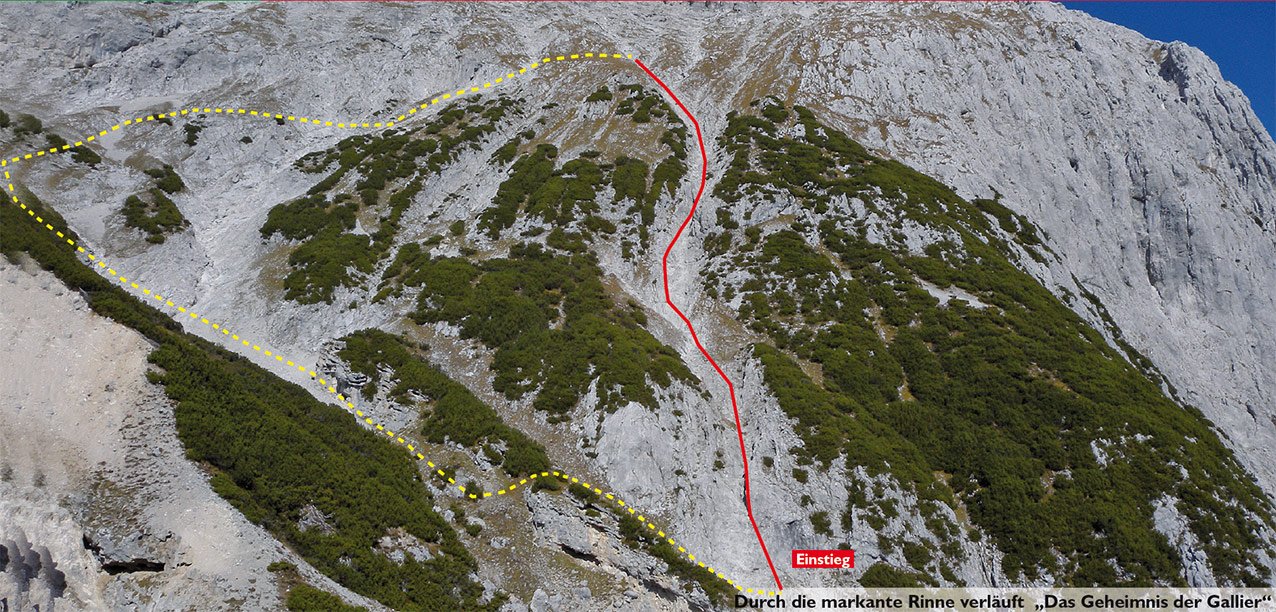 Vom Parkplatz folgt man dem Weg bis zum Strassberghaus und von dort weiter zur Alplhütte. Von der Hütte auf dem Normalweg in Richtung Karkopf bis zum sogenannten Wetterkreuz; ein markantes Kreuz auf einer Kuppe. Dort folgt man noch kurz dem Weg, bis dieser in das große Schuttfeld führt. Im Schuttfeld sofort rechts hinunter, bis man links einen kleinen Wasserrillenpfeiler sieht, zu dem man hinüberquert. Rechts neben dem Pfeiler ist die große, markante Rinne und dort ist auch der Einstieg. Der Routenname „Das Geheimnis der Gallier“ ist direkt am Einstieg groß angeschrieben.