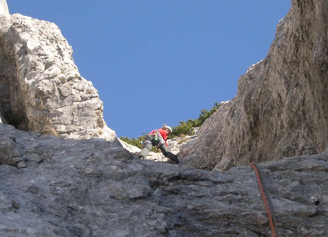 Die Tour ist sehr gut mit Bohrhaken versichert, leider fehlen aber schon ein paar Laschen an den Bohrhaken, vermutlich durch Steinschlag. Die Absicherung ist aber trotzdem ausreichend. Im Frühjahr ist die Route nicht zu empfehlen, da oft noch Schnee vorhanden sein kann. In der Klettersaison ist im Besonderen auf Steinschlag zu achten, da man in der Rinne den von oben kommenden Steinen nicht ausweichen kann.