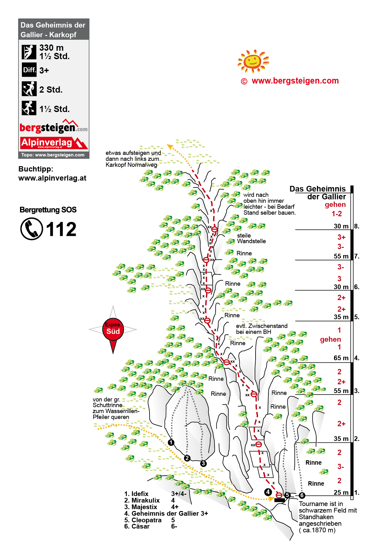 Mit dieser Tour wurde eine leichte, für Kinder und Einsteiger gleichermaßen geeignete Route eingerichtet. Obwohl die Tour weit unter dem Gipfel endet, ist die Kletterei frei von rutschiger Botanik. Dank des festen und griffi gen Gesteins ist die Schlüsselseillänge, im Schwierigkeitsgrad 3+, auch ohne den berühmten gallischen Zaubertrank zu meistern. Die Orientierung in der Route fällt auch einfach aus, denn der Routenverlauf folgt immer der großen Rinne bis zum Ausstieg, wo man, nach erfolgreichem Beenden der Tour, auf der schönen Wiese gemütlich Brotzeit machen und die Aussicht genießen kann. In Verbindung mit dem Klettergarten im Einstiegsbereich, lohnt sich ein Besuch noch mehr.