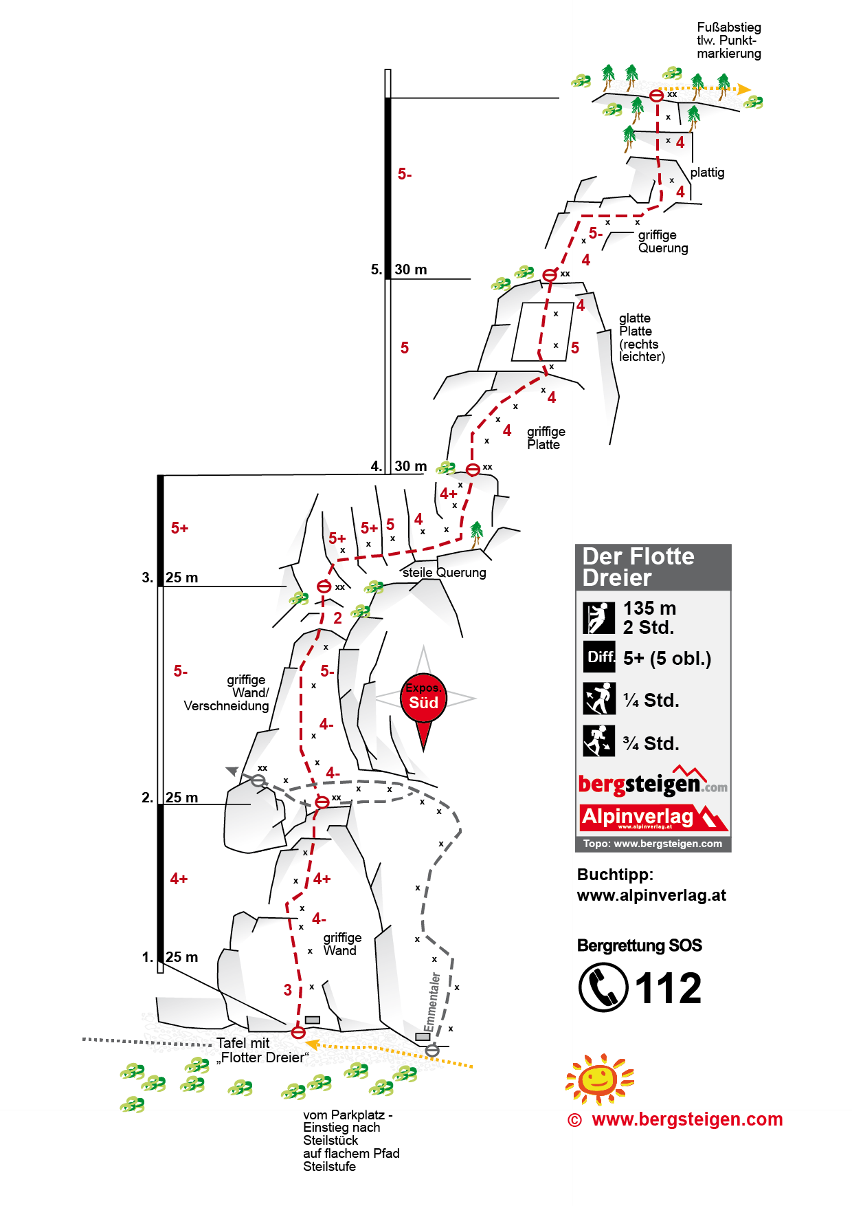 „Der Flotte Dreier“ ist neben der „Bronchitis“ eine der beliebtesten Sockeltouren an der Martinswand. Die Tour wird nach oben hin immer besser. Die Schlüsselstelle ist eine schöne Querung, welche gleich zu Beginn schwer ist. Danach kommt noch eine 5er-Plattenstelle, diese klettert man am besten rechts. Beim ersten Standplatz kreuzt von rechts die Route „Emmentaler“ - von dort steigt man gerade die Verschneidung weiter hinauf.
