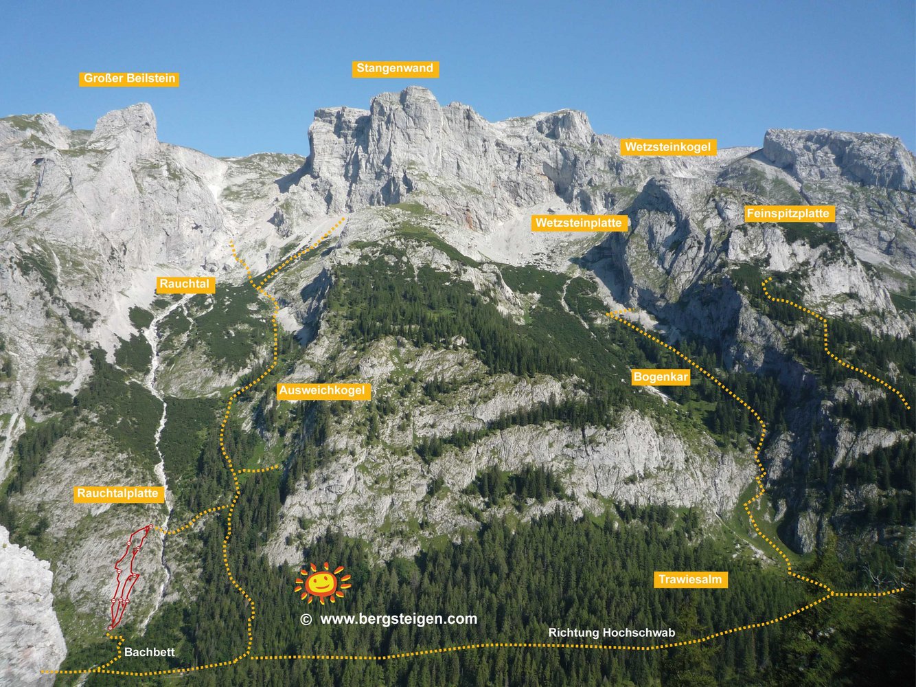 In mehreren Kehren die Steilstufe unter der Hundswand umgehen, weiter auf dem guten Weg Richtung Trawiesalm. Der Weg quert ein ausgetrocknetes Bachbett, es folgt ein markanter Lawinenkahlschlag von dem aus man die Stangenwand bereits sehen kann. Nach ca. 50 m von diesem kurz vor einer kleinen Lichtung im Wald links abzweigen (Steinmann) und kurz dem Steig ins Rauchtal bis zu den ersten Felsen folgen. Dort geht die Route hinauf.
