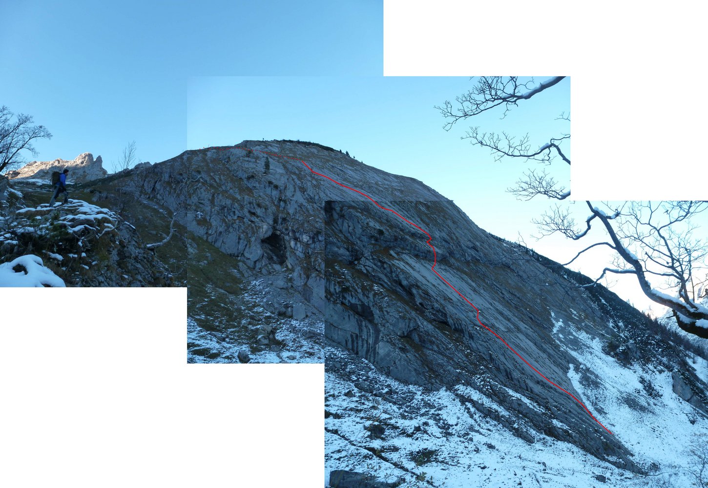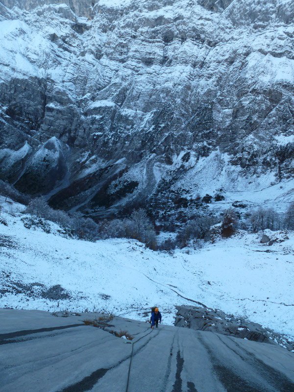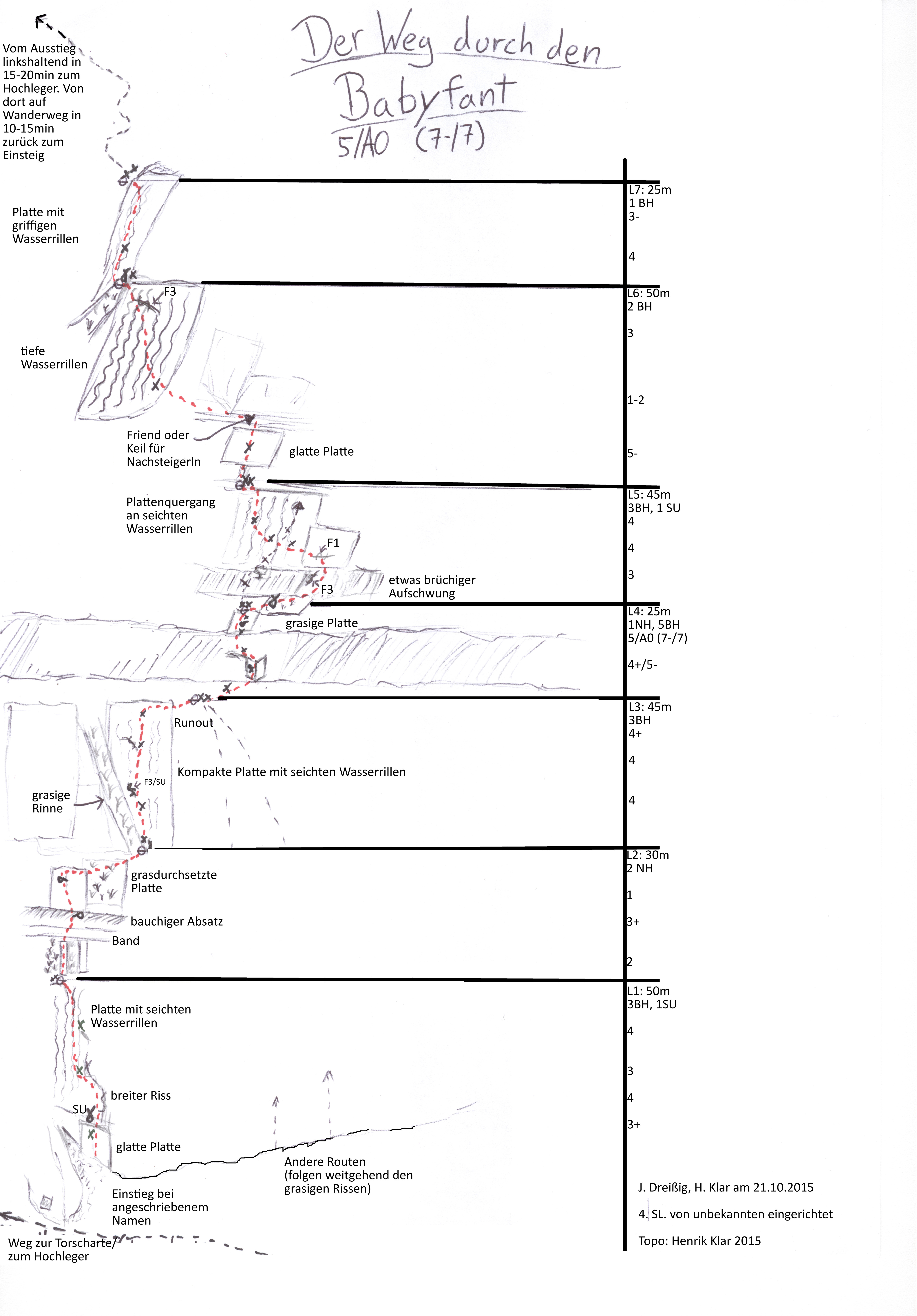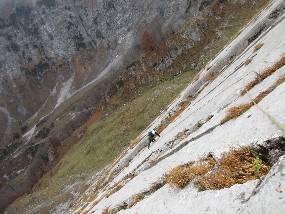 Über eine glatte Platte (BH) zu einem kleinen Absatz (SU) und über einen breiten Riss oder direkt in die seichten Wasserrillen (2BH) und in unschwieriger Reibungskletterei zum Stand. Über eine von graßigen Rissen begrenzte Platte zu einem Band und über einen kleinen Aufschwung (SH) zur nächsten Platte. Vom SH in selbiger nach rechts queren zum Stand am Beginn einer grasigen Rinne (SU+BH). Die folgende Platte in Falllinie hinauf, zuletzt Runout, der jedoch rechts durch weniger schönes aber leichteres Gelände umgangen werden kann. Vom letzten BH in der Platte scharf rechts zu Stand mit Kette. Rechtshaltend über leichte Platte auf den ersten Aufschwung zu (BH) über eine kurze seichte Verschneidung zur Kante und frei (7-), oder technisch (5/A0) auf die nächste Platte zum Stand mit Kette. Nun nicht den BH gerade Hinauf folgen, sondern rechtshaltend (SU) über den Aufschwung (Cam 3 möglich) und in einem langen Quergang nach links und über seichte Wasserrillen vom letzten BH gerade hinauf zu Stand auf kleinem Band. Vom Stand gerade hinauf über glatte Platte (BH, oberhalb evtl. Keil o. Cam für NachsteigerIn) und anschließend linkshaltend zu markanter Platte mit ausgeprägten Wasserrillen. Über diese zum nächsten Stand am linken, oberen Rand der Platte (SU+BH). Weiter über kleinen Aufschwung in Platte (BH) zum Stand am Ende der Platte links.