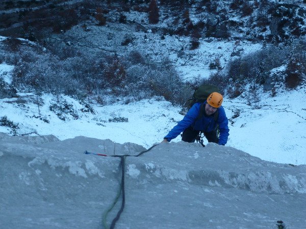 Eine kurze Stelle über die Kante in der 4. Seillänge gut A0 möglich.