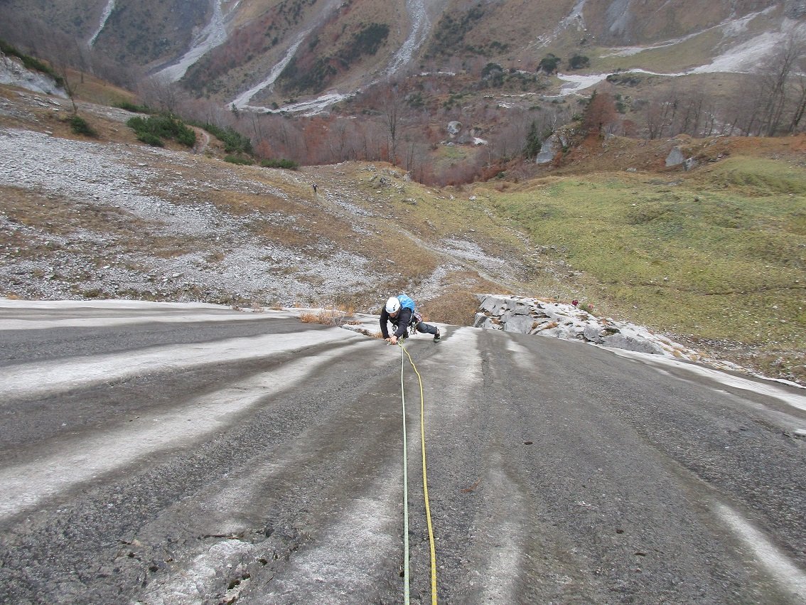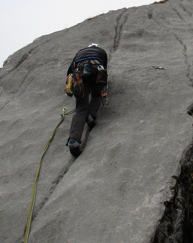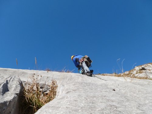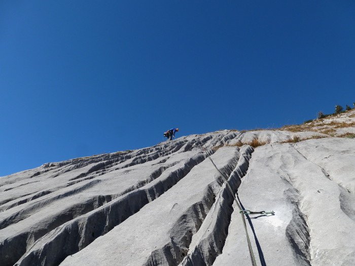 Weitere Hakenabstände können oft durch mobile Sicherungen entschärft werden, nicht jedoch in den Platten der 1. und 3. Seillänge. Kommt aber auch keine böse Überraschung, wenn man vom Haken wegklettert.