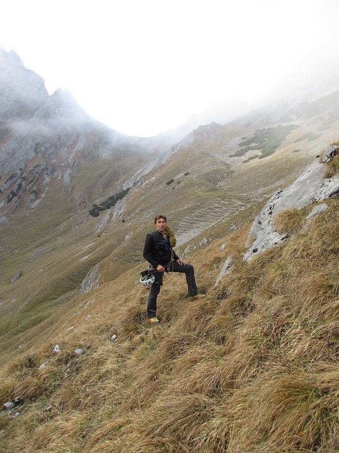 Vom Ausstieg linkshaltend, anfangs leicht aufsteigend, stets dem offensichtlichstem Weg folgend zum Hochleger queren (15-20 min) und von dort in 10-15 min über den Wanderweg zurück zum Einstieg. Alternativ kann auch über die andere Tour in der Wand abgeseilt werden.