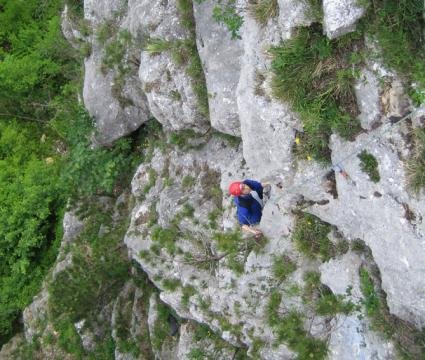 Über die Tour 1x25m + 1x20m abseilen. Zuletzt erreicht man ein Grasband unterhalb des Einstieges.