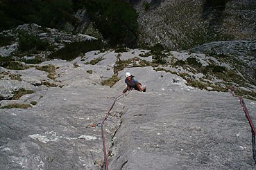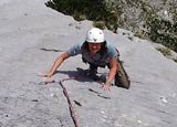 Schöne und nicht allzu lange Sportkletterei von den Schwabspezialisten G. Graber u. K. u. T. Richter. Das Finale wartet vor dem allerletzten Bolt in der 5. SL., aber keine Angst, die Tour ist bei den schweren Stellen gut mit BH gesichert. Die Stelle kann gut A0 gemacht werden. Einzig im leichten Gelände (bis 6+) sollte man sicher unterwegs sein. Der Fels ist bis auf wenige Stellen durchwegs fest (Foto). Auf den Standplätzen liegen manchmal lose Steine (Achtung bei Nachsteigern). Wer hier mit Wasserrillen à la Wetzsteinplatte rechnet wird aber enttäuscht sein, denn es dominieren Platten (Foto) wie in der Hundswand. Zusammenfassend eine schöne und lohnende Tour.