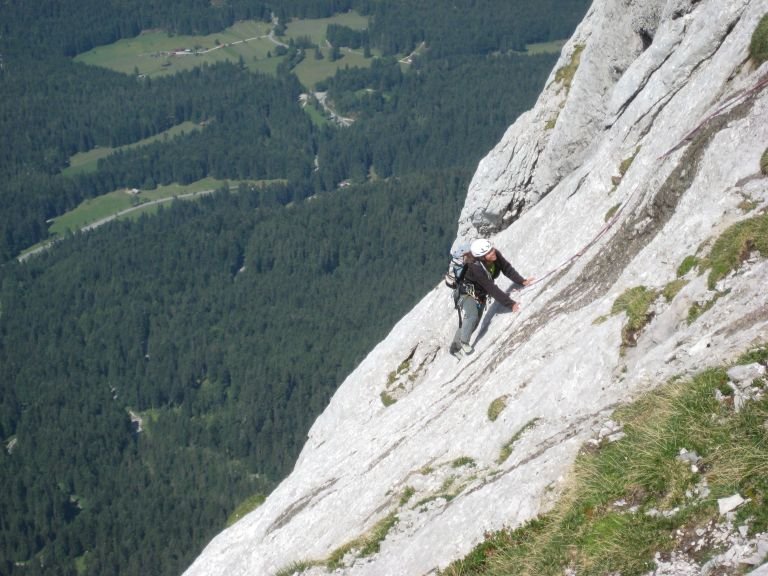 Sehr schöne Platten und Wasserrillenkletterei in überwiegend festem, sehr rauem Wettersteinkalk.