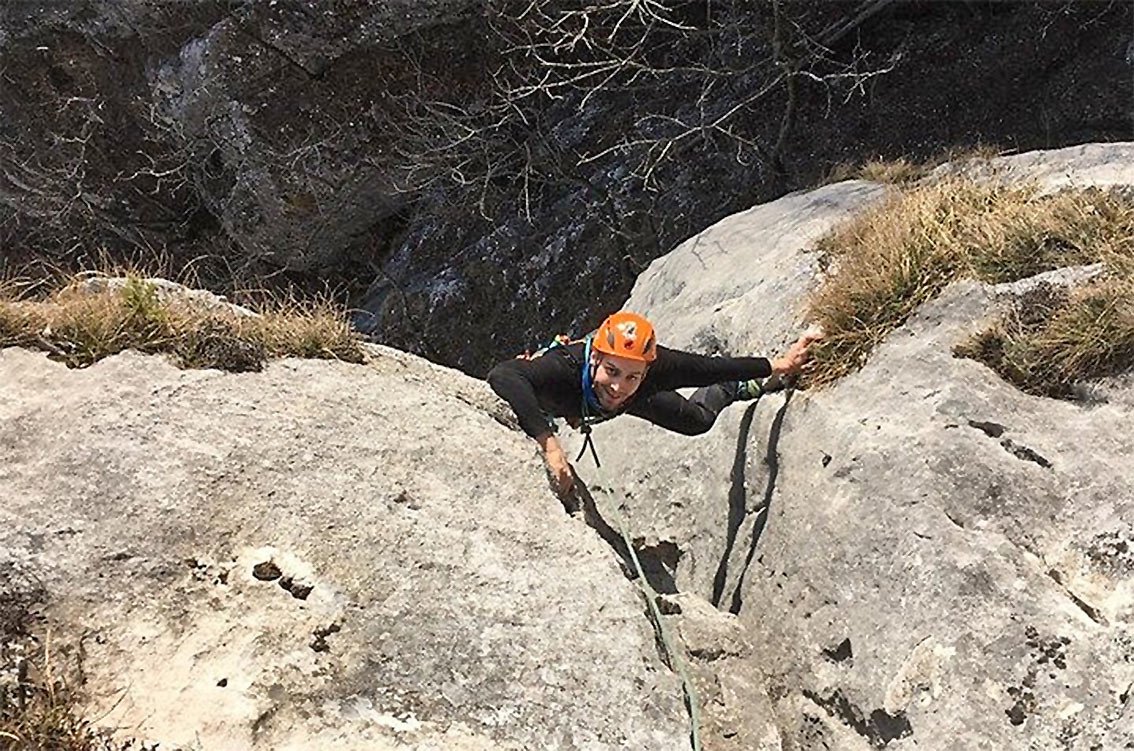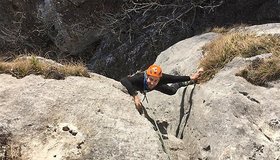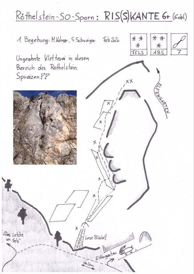 Die Route Ris(s)kante ist eine schöne Variante in der 7ten Seillänge der Route Elfengarten am Röthelstein Südostsporn. Rund 30 Klettermeter in gutem Fels und es darf gespreizt werden!