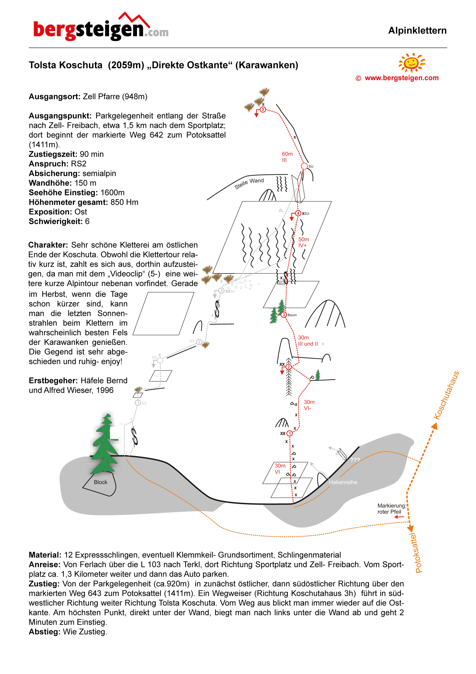 Sehr schöne Kletterei am östlichen Ende der Koschuta. Obwohl die Klettertour relativ kurz ist, zahlt es sich aus, dorthin aufzusteigen, da man mit dem „Videoclip“ (5-) eine weitere kurze Alpintour nebenan vorfindet. Gerade im Herbst, wenn die Tage schon kürzer sind, kann man die letzten Sonnenstrahlen beim Klettern im wahrscheinlich besten Fels der Karawanken genießen. Die Gegend ist sehr abgeschieden und ruhig- enjoy!