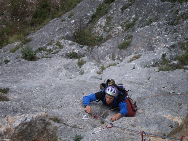 Von der ersten Kehre über den Milakklettergarten mit seinen eingefärbten Touren unter die Sonnenuhrwand. Nun auf Steigspuren aufwärts, teilweise mit alten Seilen versichert, bis zu einer Scharte bei Felskopf, hier beginnt der Einstiegsgrat zum ersten Stand.