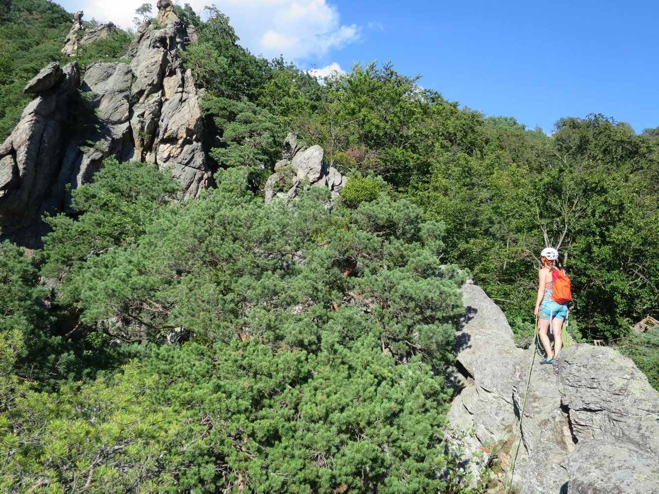 Vom Ausstieg kurz hinauf und dann links haltend zur Dürnsteiner Kanzel (512m), wenige Schritte nördlich der Kanzel geht westlich ein Steig hinunter, diesem Folgen. Er kreuzt 1x den Wachauer Grat (hier auf Steinmänner achten) und führt in 15 Min. zum Einstieg.