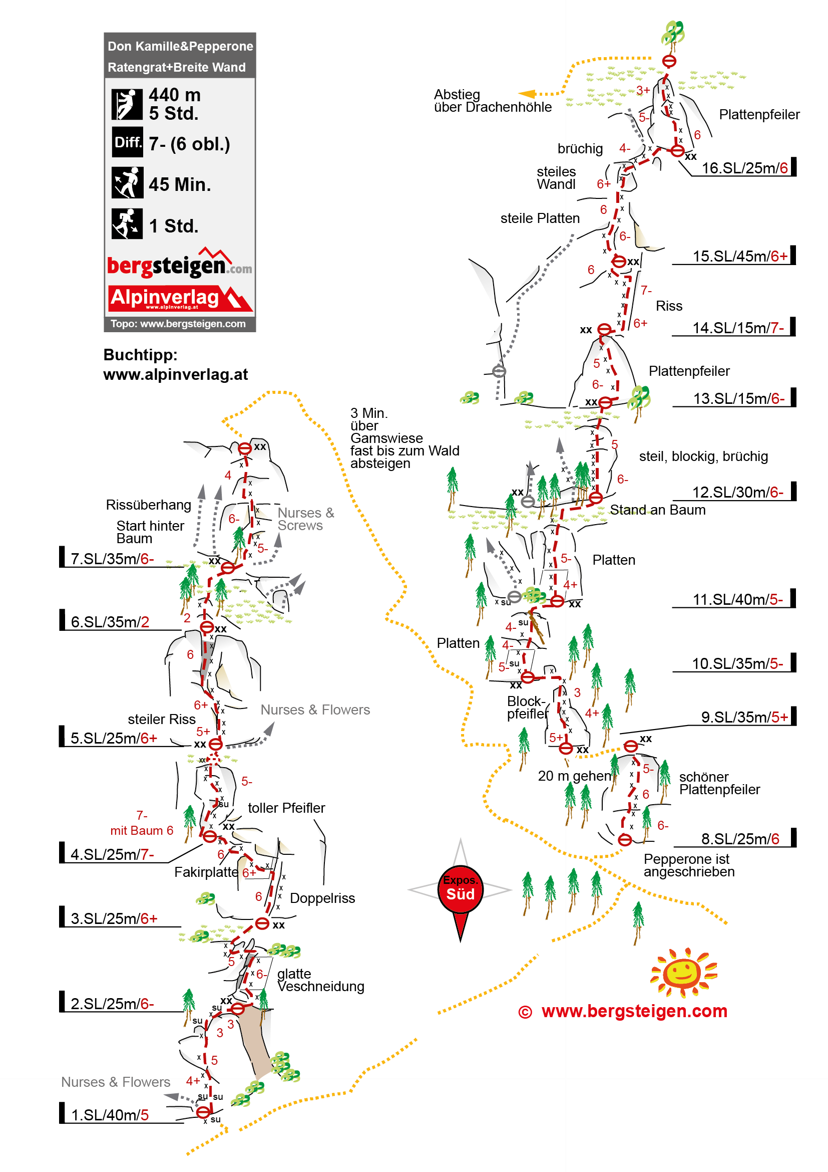 Sehr lange Genussroute, die am Ratengrat beginnt (Don Kamille) an der Breiten Wand weiter geht (Pepperone). Die Don Kamille bietet ausgesprochen schöne Kletterei und gehört zu den besten Ratengrat Touren. Der Weiterweg (Pepperone) an der Breiten Wand beginnt genussvoll über plattige Wandstufen im Wald und wird dann schwieriger und steiler. Hier sind auch in Seillänge 12 und am Ende der 15. einige brüchige Klettermeter dabei.