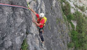 1 x 60 m Einfachseil, 15 Expressschlingen und Helm.