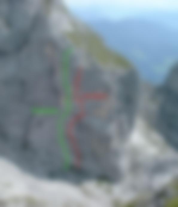 Die alte Route führte rechts im Riss VI+ (schlechte Absicherung)