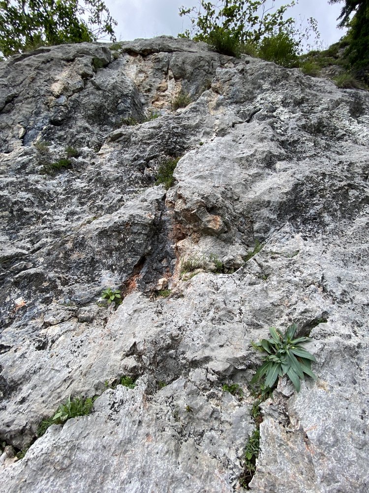 Anfangs leichte Querung über Platten(4), hiernach steil nach oben einem Riss folgend(5) um wiederum über eine Platten/Riss Kombination(5) bis unterhalb des Schlüsselpunktes zu kommen, welcher sich direkt unterhalb einer kleinen Nase(6+) befindet. Hier ist etwas mentale Stärke gefragt, da trotz guter Griffe, es einem die Schwerkraft nicht leicht macht. Nach überwinden der Schlüsselstelle etwa 5m nach oben und nach Rechts ins Gras queren(5), wo man den Standplatz findet.