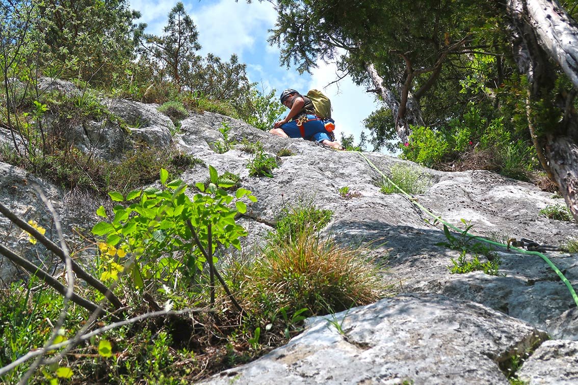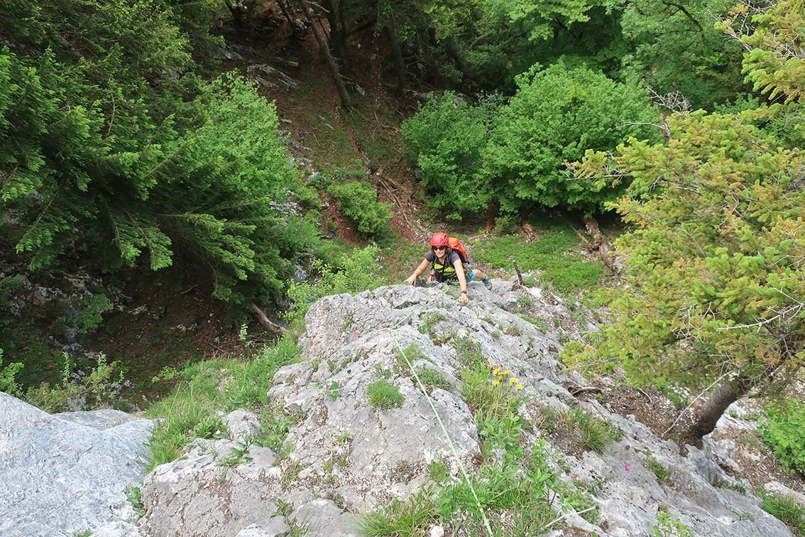 Zuerst auf Pfadspuren nach rechts. Ab dem Irma la Douce Ausstieg ist der Abstieg mit roten Punkten markiert, bei Nässe aber heikel. Eine Steilstufe ist mit einem Stahlseil gesichert. Nach dieser Steilstufe erreicht man den Wanderweg auf dem man weiter absteigt. Anm: Auf dem Felskamm nicht den roten Stangen, sondern der Punktmarkierung folgen (anfangs eher rechts). Dem Wanderweg nach rechts hinab zum Klettergarten folgen und von dort zurück zum Parkplatz.