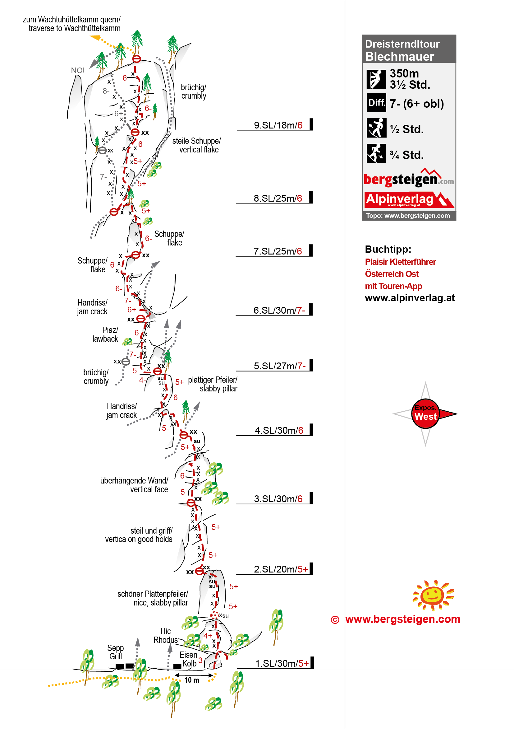 Gute Route, die im Mittelteil bereits 1951 erschlossen wurde. Im Jahr 2024 wurde die Route saniert und unten und oben mit eigenständigen Seillängen verlängert. Das Ergebnis ist eine lohnende, über weite Strecken sehr gut abgesicherte Tour überwiegend im 6ten und mit zwei Stellen im unteren 7ten Grad.