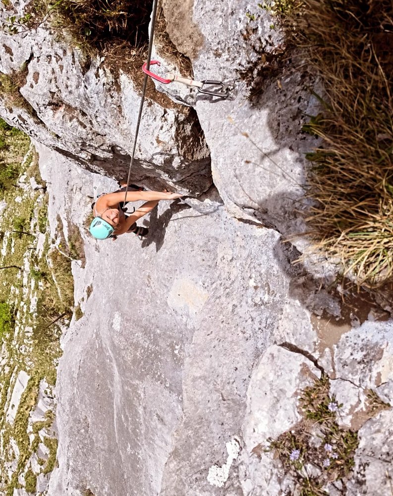 2 x 50 m Doppelseil, 14 Expressschlingen und Helm.