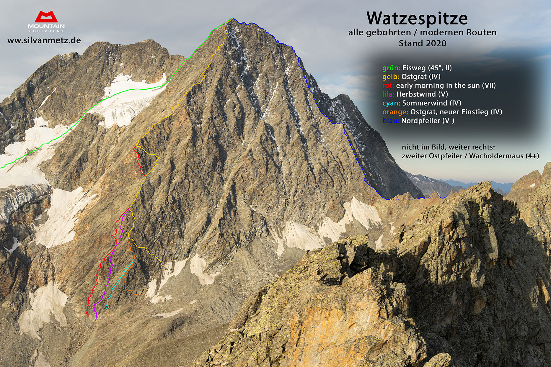 Und auf der Seite der Kaunergrathütte https://kaunergrathuette.at/kletterinfos/kletterrouten-watzespitze-3533-m-ostwand/ (Mit Wandbild)