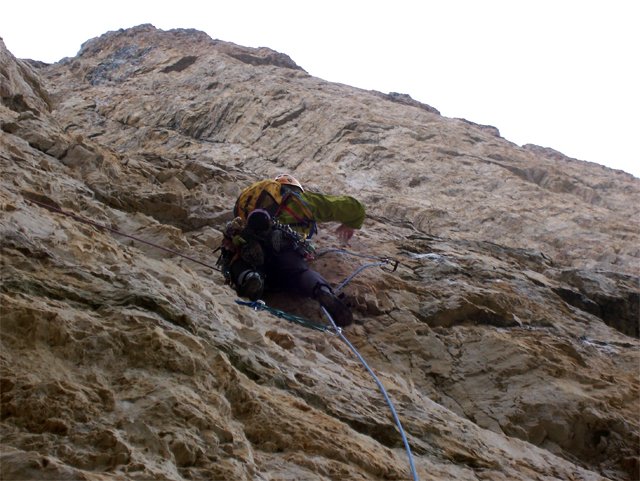 Eindrucksvolle Routenführung an gelbem, teils sehr brüchigen Fels. Es ist eine sehr anspruchsvolle und steile Tour, die selbst abgesichert werden muss.