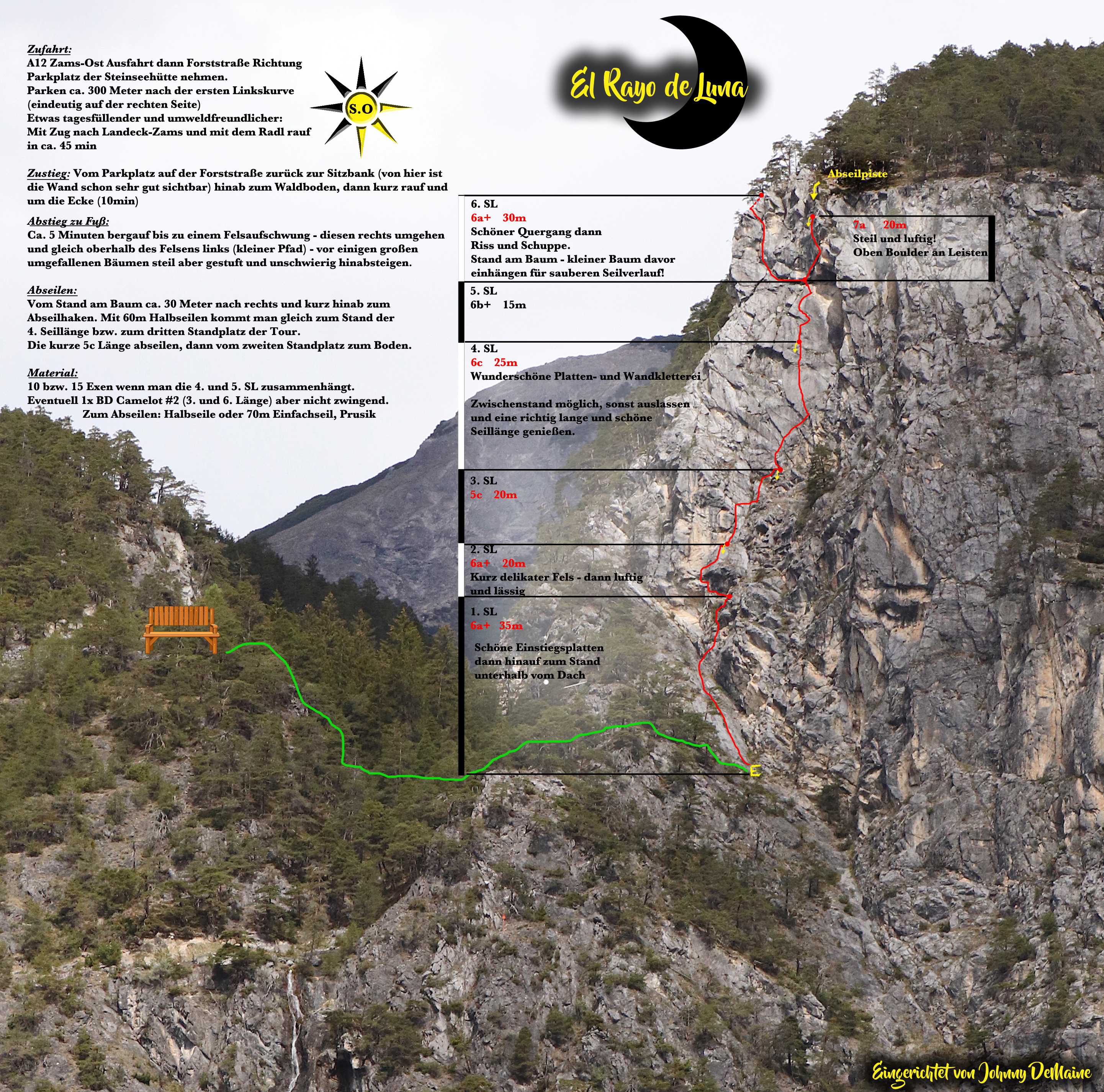 Abseilen: Vom Stand am Baum ca. 30 Meter nach rechts und kurz hinab zum Abseilhaken. Mit 60m Halbseilen kommt man gleich zum Stand der 4. Seillänge bzw. zum dritten Standplatz der Tour. Die kurze 5c Länge abseilen, dann vom zweiten Standplatz zum Boden. Mit einem 70m Einfachseil ist der letzter Abseiler sehr knapp, aufpassen!