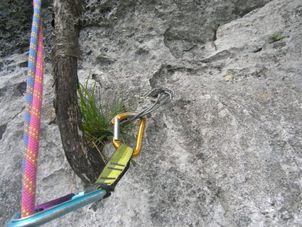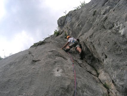 Wunderschöne, abwechslungsreiche Plaisirtour, die sich geschickt den Weg durch die doch etwas begrünte Wand sucht. Es dominiert Platten- und Kantenkletterei, wobei in den Platten immer wieder gute Henkel auftauchen. Eine tolle Tour.