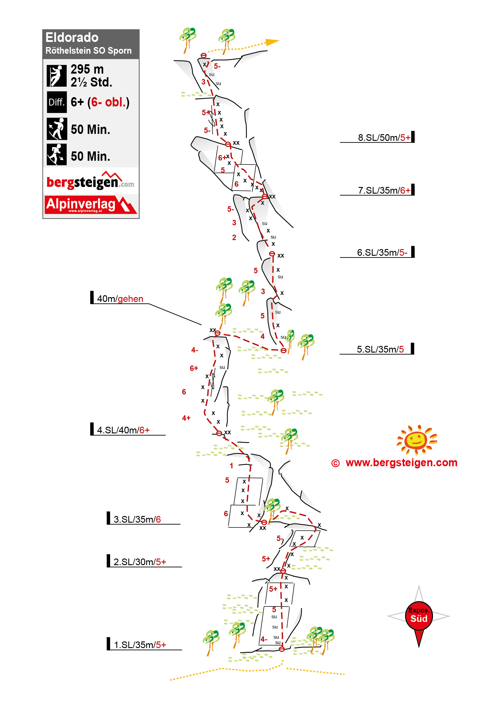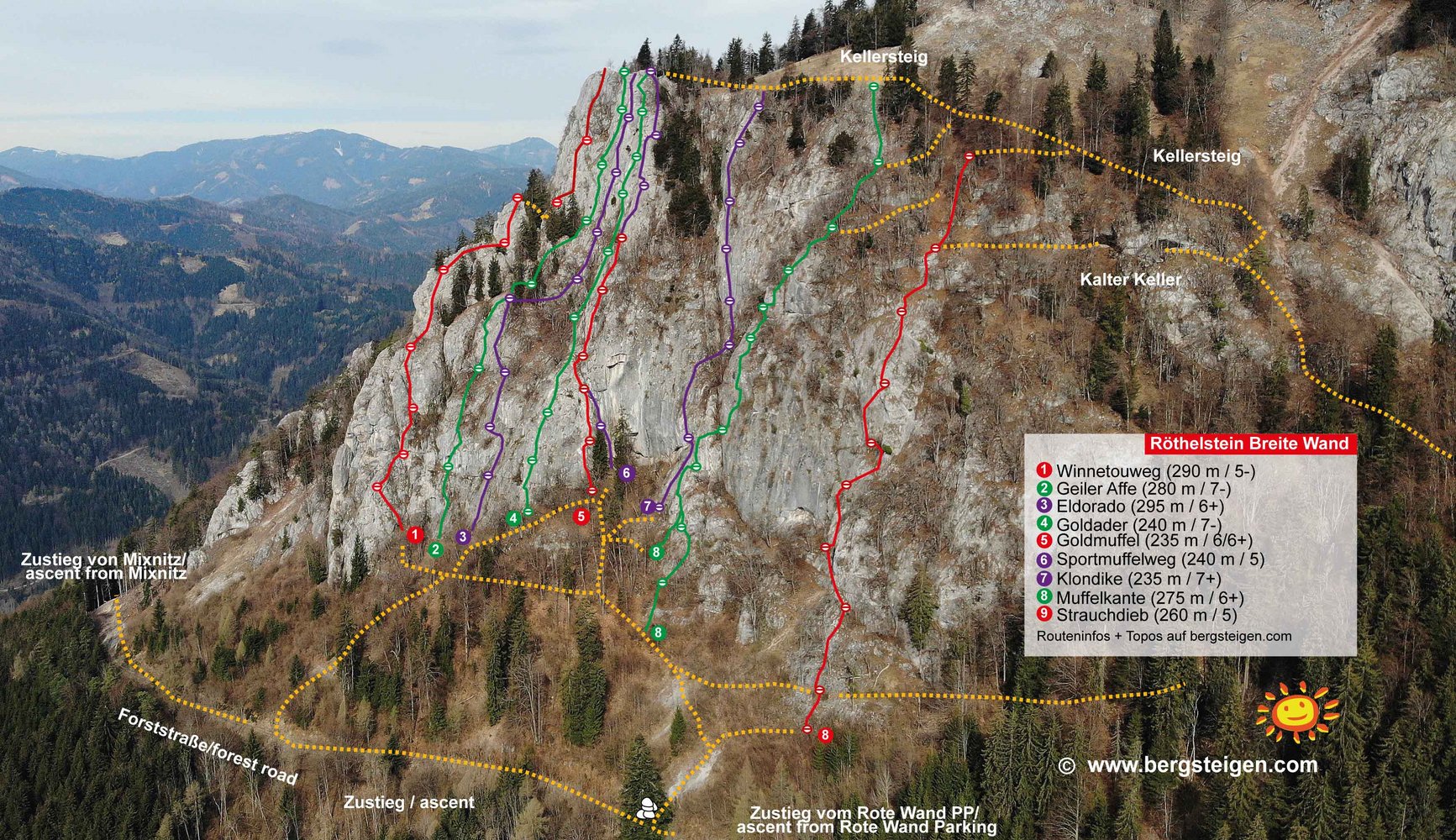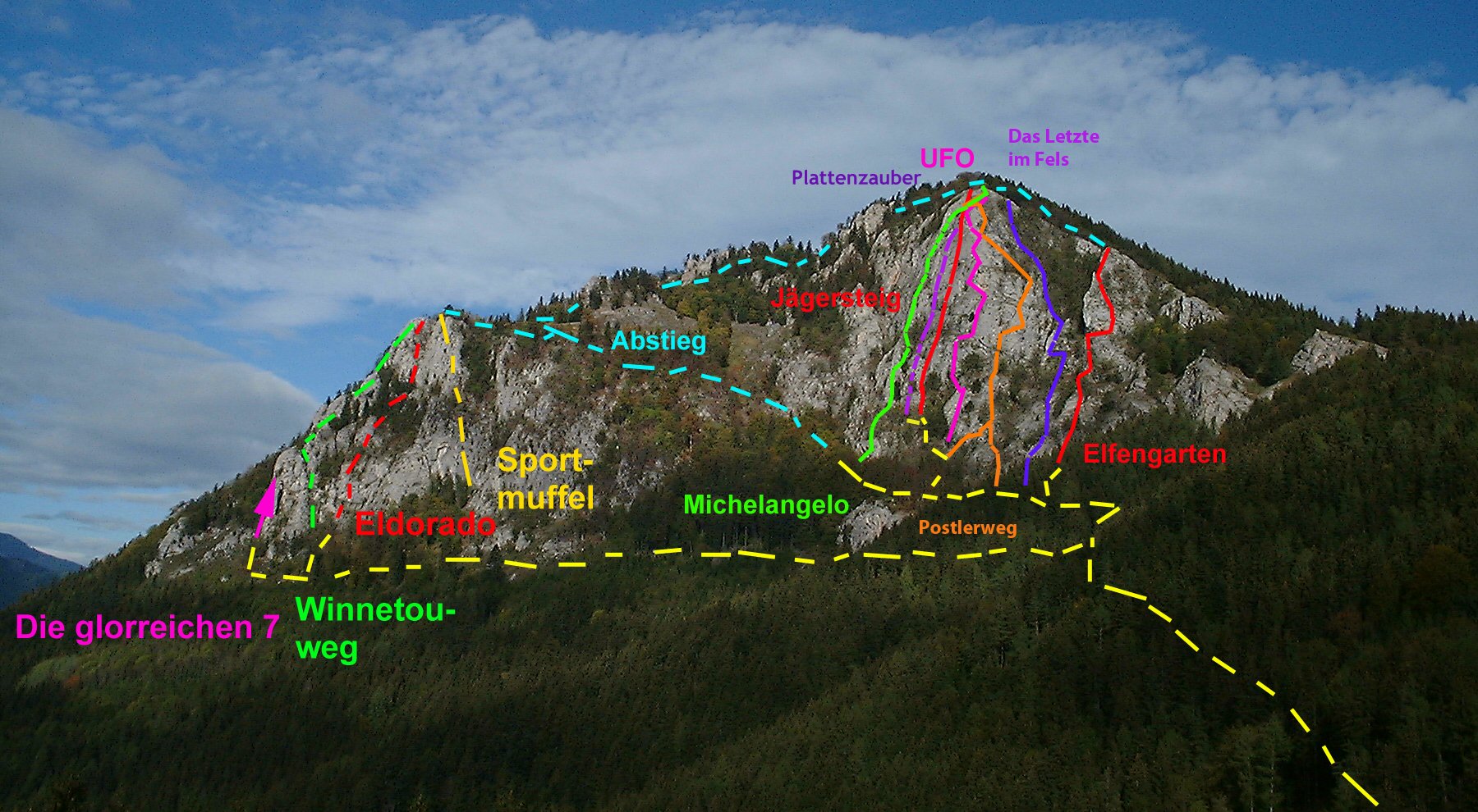 Vom Parkplatz an seinem hinteren Ende auf kleinem Weg (Schranken) anfangs fallend, an einer schönen Lichtung mit kleiner Hütte vorbei bis man unterhalb eines Jagdhauses eine breite Forststraße betritt. Dieser bergauf einige Minuten folgend zum Waldrand, hier links in den Wald auf eine Kuppe zu dreifacher Weggabelung bei einem Gatter. Auf der fallenden Wegseite (Markierung Richtung Mixnitz) weiter bis man wiederum eine Forststraße erreicht und dieser bergauf (rechts) folgt, bis sie nach einigen Minuten eben wird. Weiter auf ihr bis fast zu ihrem Ende, und hier rechts steil auf kleinem Steig (Steinmann am Beginn) zum Wandfuß aufwärts - der Steig ist in schlechtem Zustand und tw. recht zugewachsen. Rechts der Wand entlang bis zu einer markanten Platte mit der Aufschrift Eldorado (50 min). Dieser Zustieg ist etwas kürzer und bequemer als von Mixnitz über den Ratengrat, da die Ausgangshöhe größer ist.