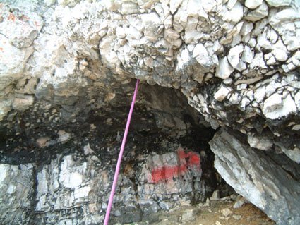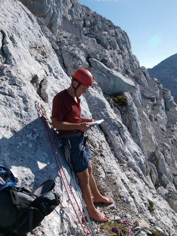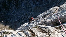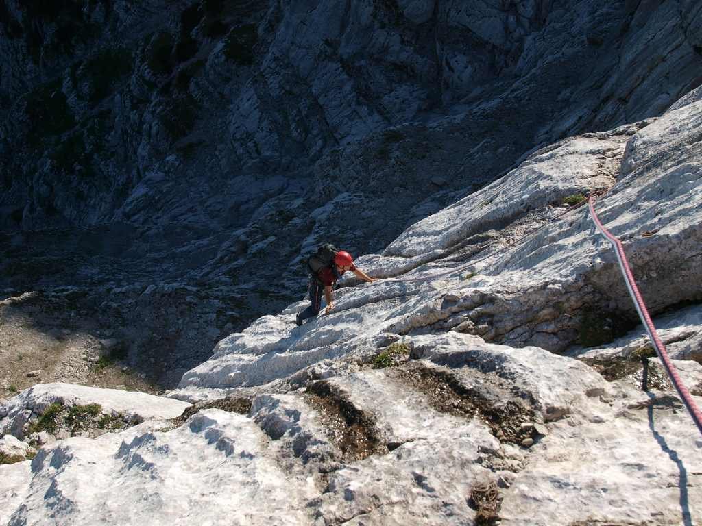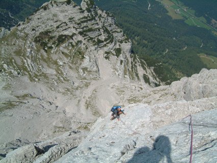 Eine weitere Möglichkeit in die Gjaidstatt zu queren bietet sich von der laut Topo 31. SL 1x abseilend und abkletternd (2) im oberen Teil der Route.