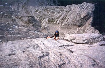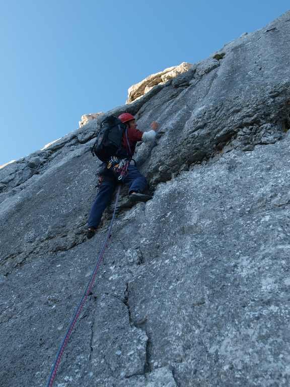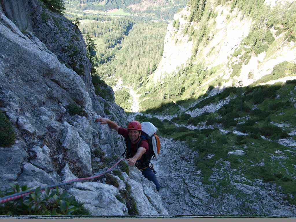 Die leichteste Möglichkeit bietet sich auf dem Band nach der laut Topo 24. SL. Dieses verfolgend leicht in die Gjaidstatt queren und von dieser absteigen zum Einstieg (Stellen 3).