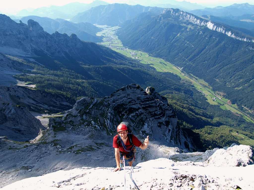 Die Tour sollte nicht unterschätzt werden, Dreierseilschaften sollte man wegen der Länge (38 SL) auch vermeiden um schnell zu sein. Der Abstieg über den Grat zum Waidringer Nieder (grasige Kletterstellen im II Grad) ist bei Regen heikel!