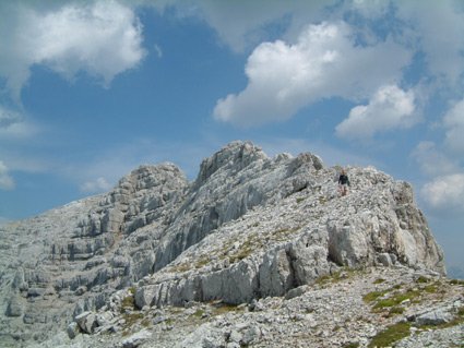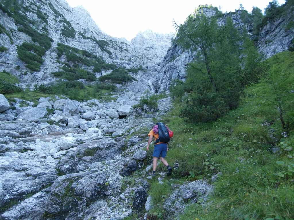 Der Forststraße entlang und bei der ersten Abzweigung nach links auf nun sehr steilem Weg zur Jagdhütte bei der Metzgeralm. Direkt hinter der Jagdhütte auf einem Steig erst durch Wald in eine Lichtung bis an deren Ende. Weiter auf Steigspuren kurz einen kleinen Graben queren und auf Steig in wenigen Minuten ins vom Nordgrat herunterziehende Bachbett. Dieses vorteilhafter immer seinen linken Ästen folgend über großblockige Aufschwünge (Stellen 3) zum Beginn des sprichwörtlich untersten Ansatz des Nordgrates. Hier E auf ca. 1450m.
