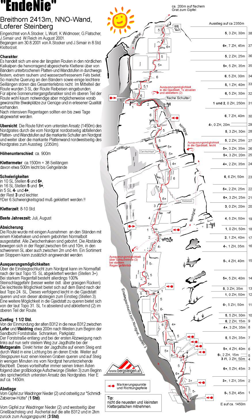 Es handelt sich um eine der längsten Routen in den nördlichen Kalkalpen die gut abgesicherte Kletterei über von Bändern unterbrochenen Platten-und Wandstufen in durchwegs festem, extrem rauhem und wasserzerfressenem Fels bietet. So manche Querung an den Bändern sowie einige leichtere Seillängen stören das Gesamterlebnis nicht. Im Mittelteil der Route wurden 3 SL der Route Reibeisen eingebunden.