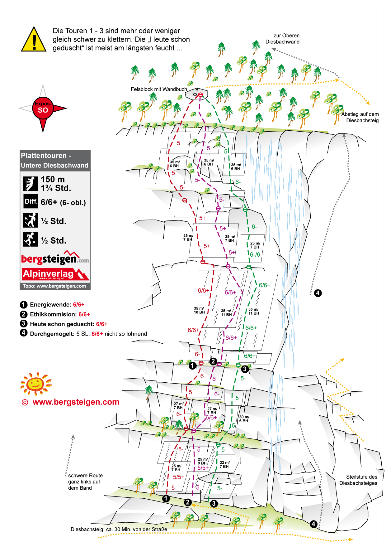 Perfekte Platten-Plaisirroute im rechten Wandteil der Unteren Diesbachwand. Tolle raue Platten weisen einem den Weg entlang von in vernünftigen Abständen gesetzten Bohrhaken. Die steile Platte im Mittelteil ist wie auch bei den Nachbartouren top zu klettern (der Stand nach der Platte ist etwas links). Oben dann über schöne Ausstiegslängen zum großen Felsblock, von dort steigt man schnell zu Fuß hinunter zum Einstieg und hängt die "Ethikkommision" oder die "Heute schon geduscht" an.