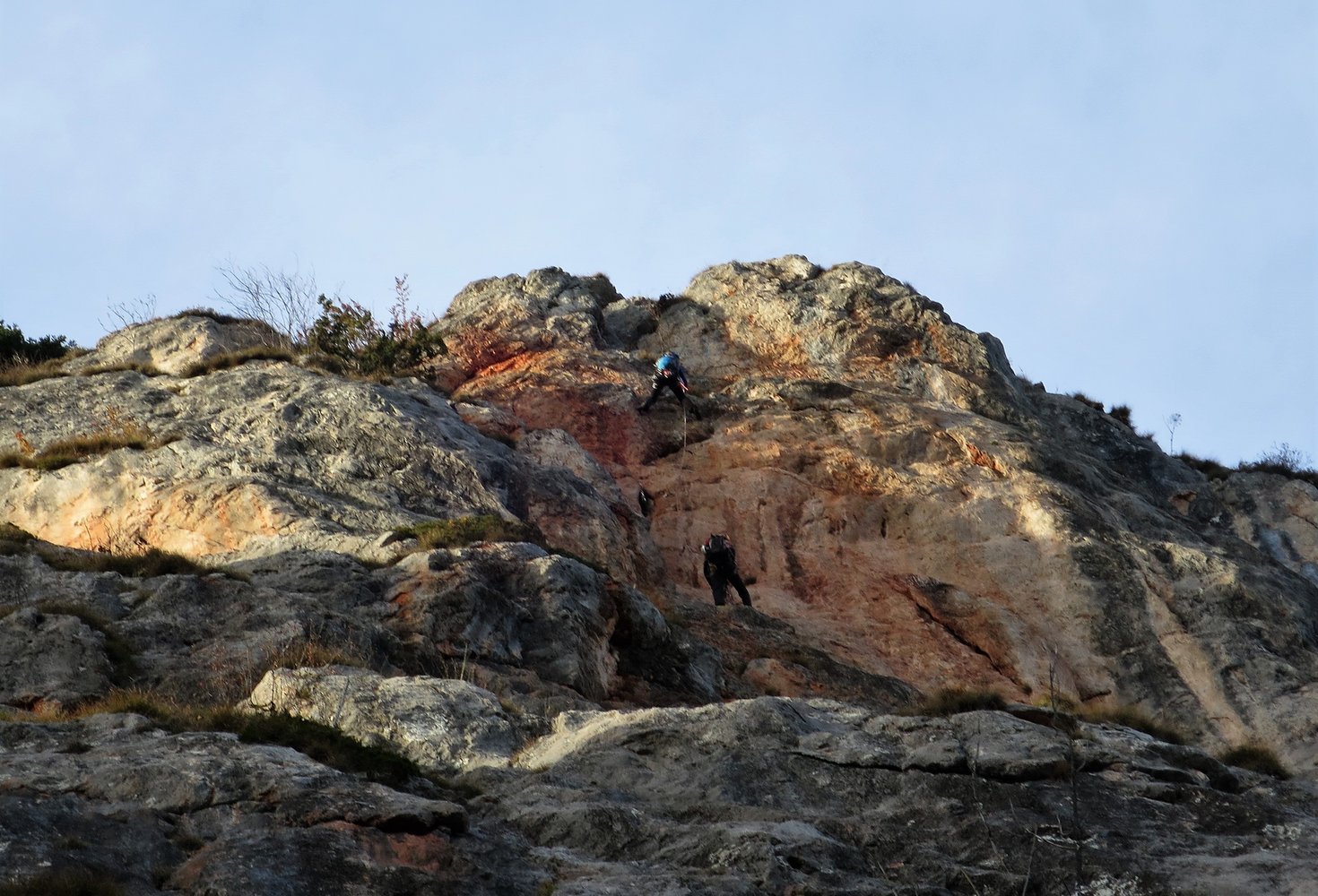 Die Route ist an den schwierigen Stellen gut mit Bohrhaken gesichert, dazwischen muss insbes. In den leichten Seillängen auch mit Friends gesichert werden.