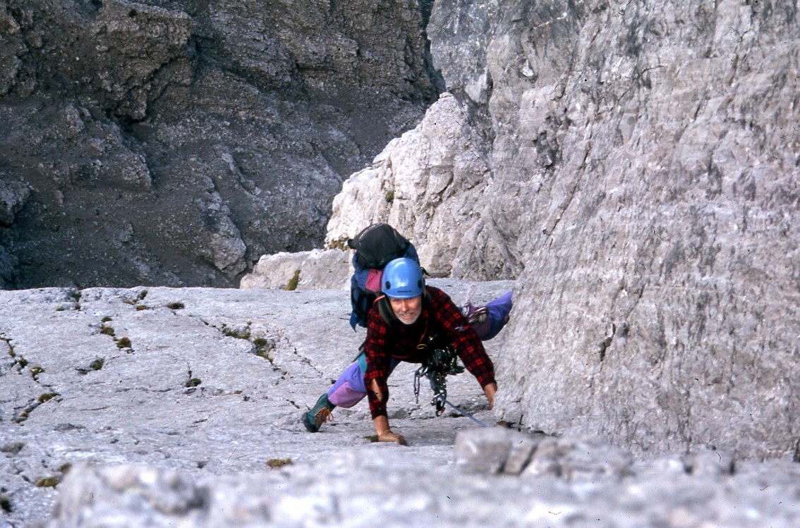 Von dem Schluchtblock wäre Fluchtmöglichkeit: Rechts haltend in der großen Rinne 3 Sl im 3. Grad zum großen Pateraband, dieses links haltend bis zum markierten Hochstadelweg (Orientierungssinn von Vorteil) verfolgen.