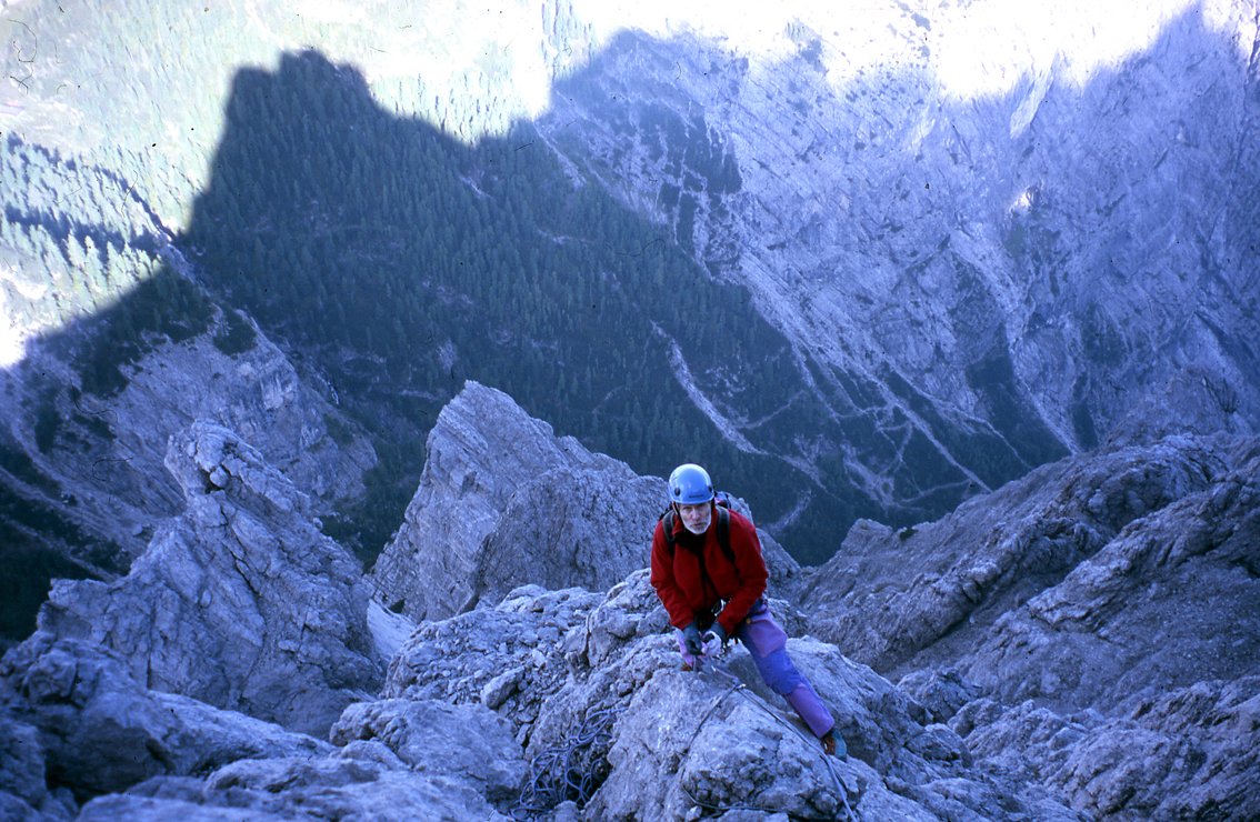 16. Sl. Über schwere Wandstelle (kurz) auf das Zwischentürmchen (15m 5) und von diesem (Abseilschlinge) ins nachfolgende enge Schartl abseilen (15m).