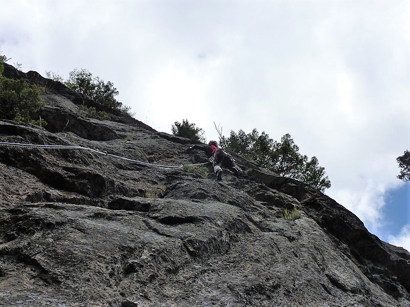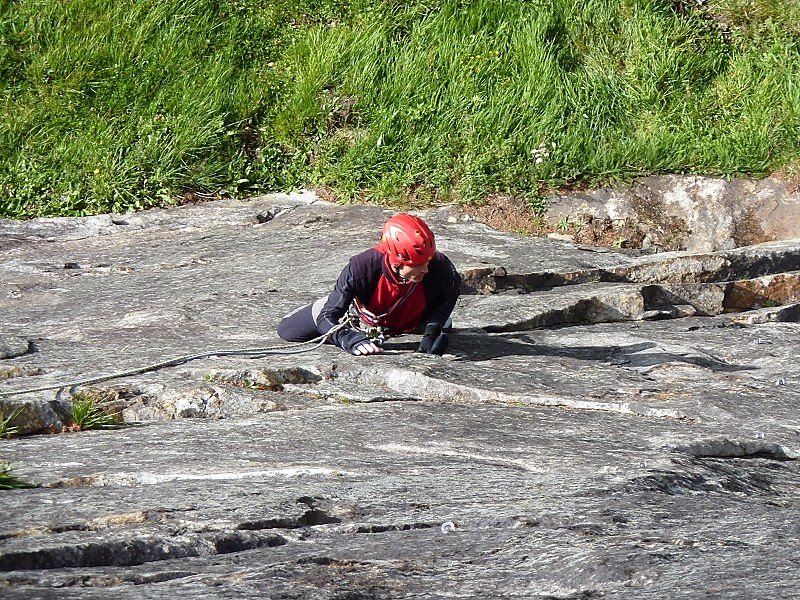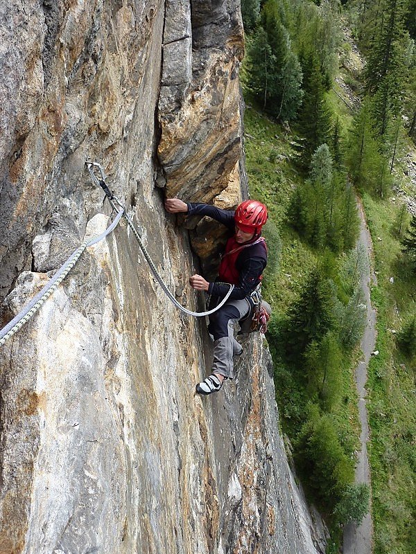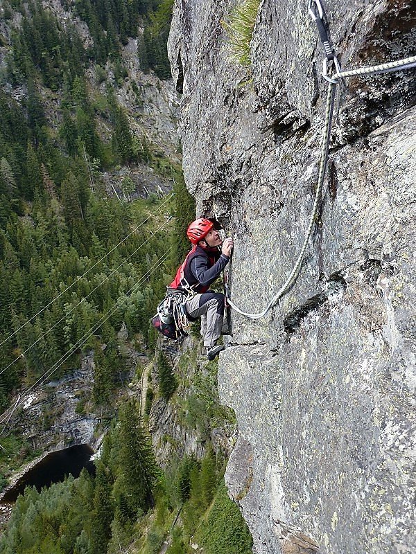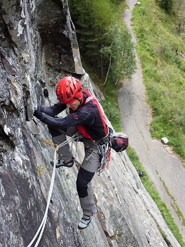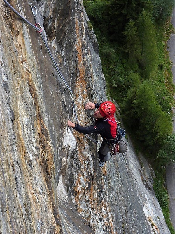 Diese Tour hier ist momentan die einzige Route, die die gesamte Wand durchsteigt. Und sie ist – wie alle Routen dieser Wand – gut!! Oben ein bisschen flechtig, aber das stört kaum. Die Schlüsselseillänge ist völlig Lange-Wand-untypisch recht steil. Hat man die ersten 10m hinter sich gebracht (und den zweiten Bolt der ersten Länge geklickt), ist sie auch gut abgesichert. Wem zuviel Luft zwischen Boden und zweitem Bolt ist, der kann auch zwei Routen weiter links über ein gut gesicherte Sportklettertour zum ersten Stand hinaufklettern (6a). Die Tour trocknet nicht so schnell ab wie die anderen Touren.