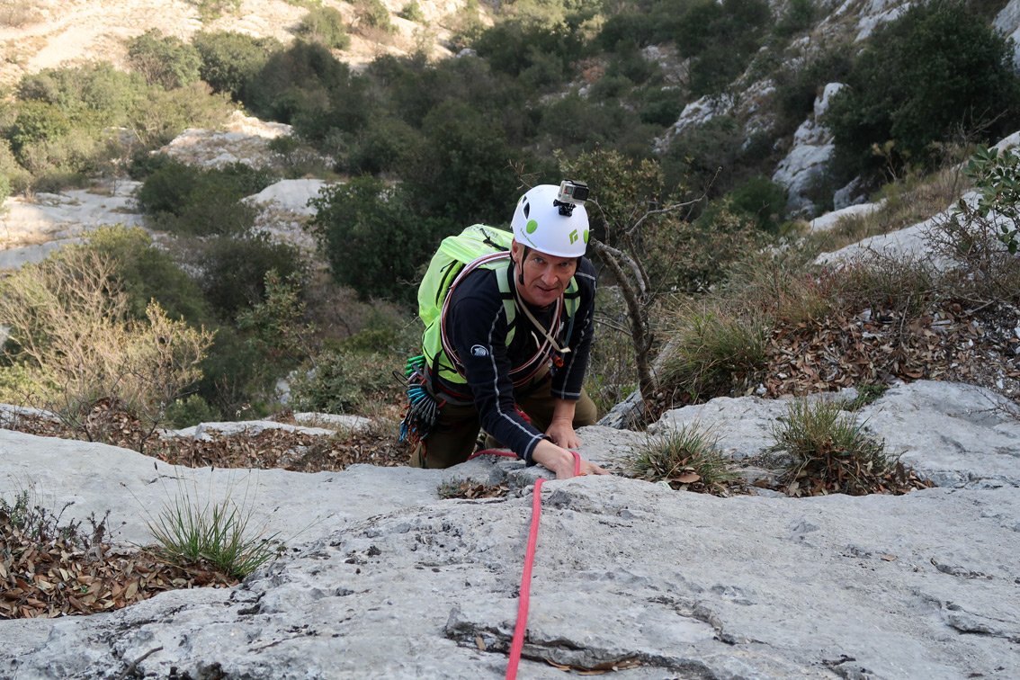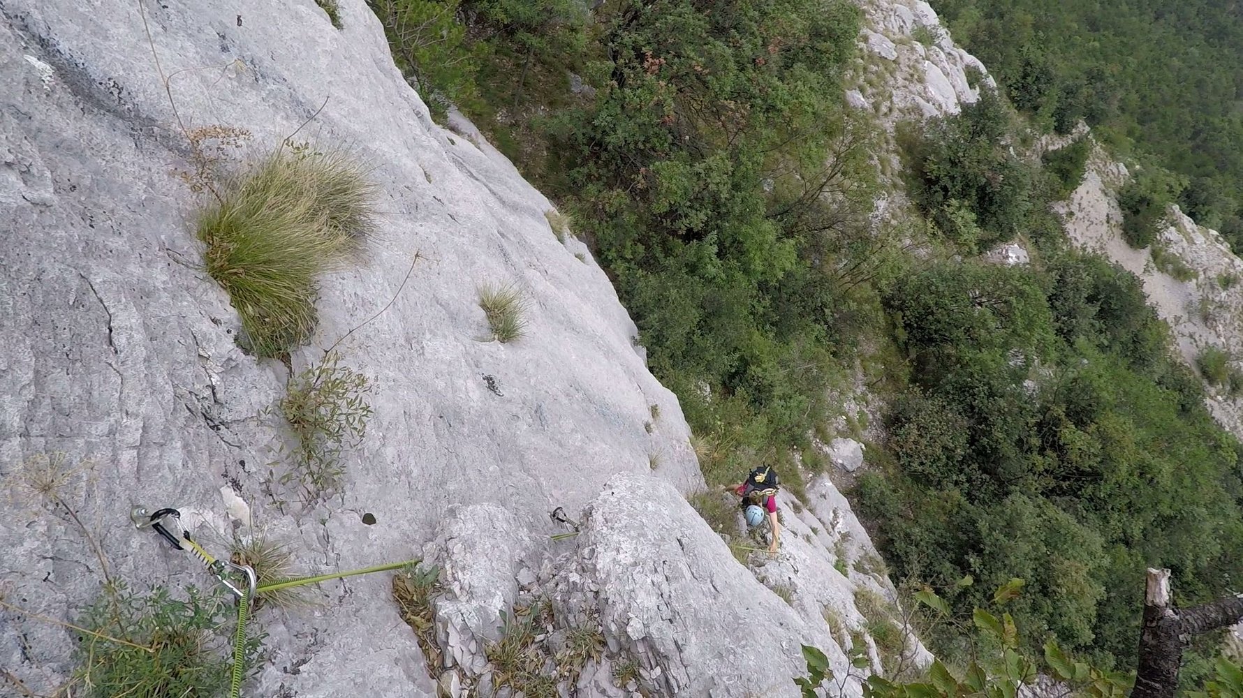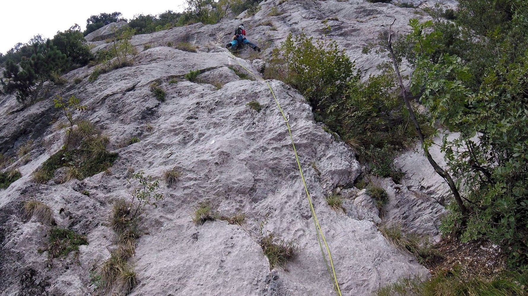 60 m Einfachseil, Helm, 14 Expressschlingen und einige Bandschlingen.