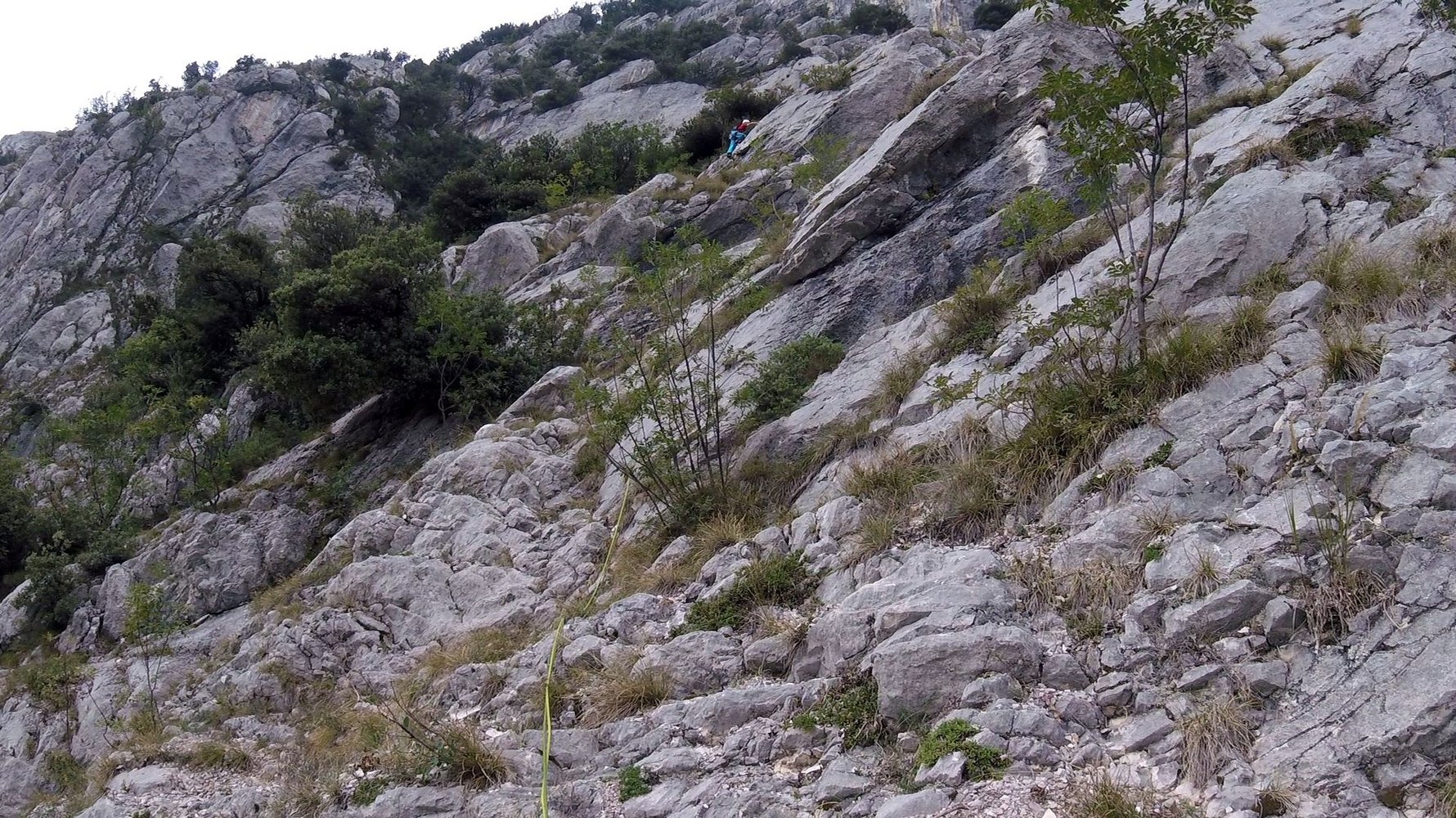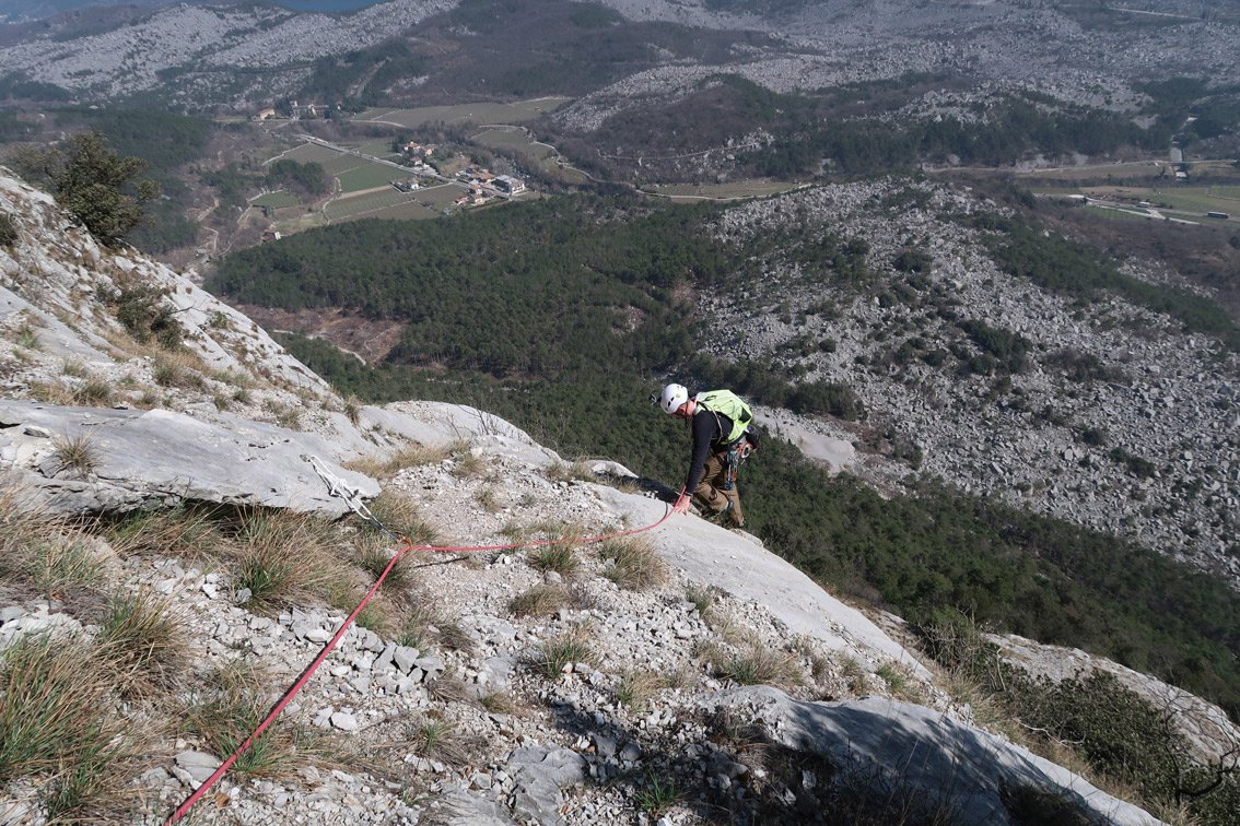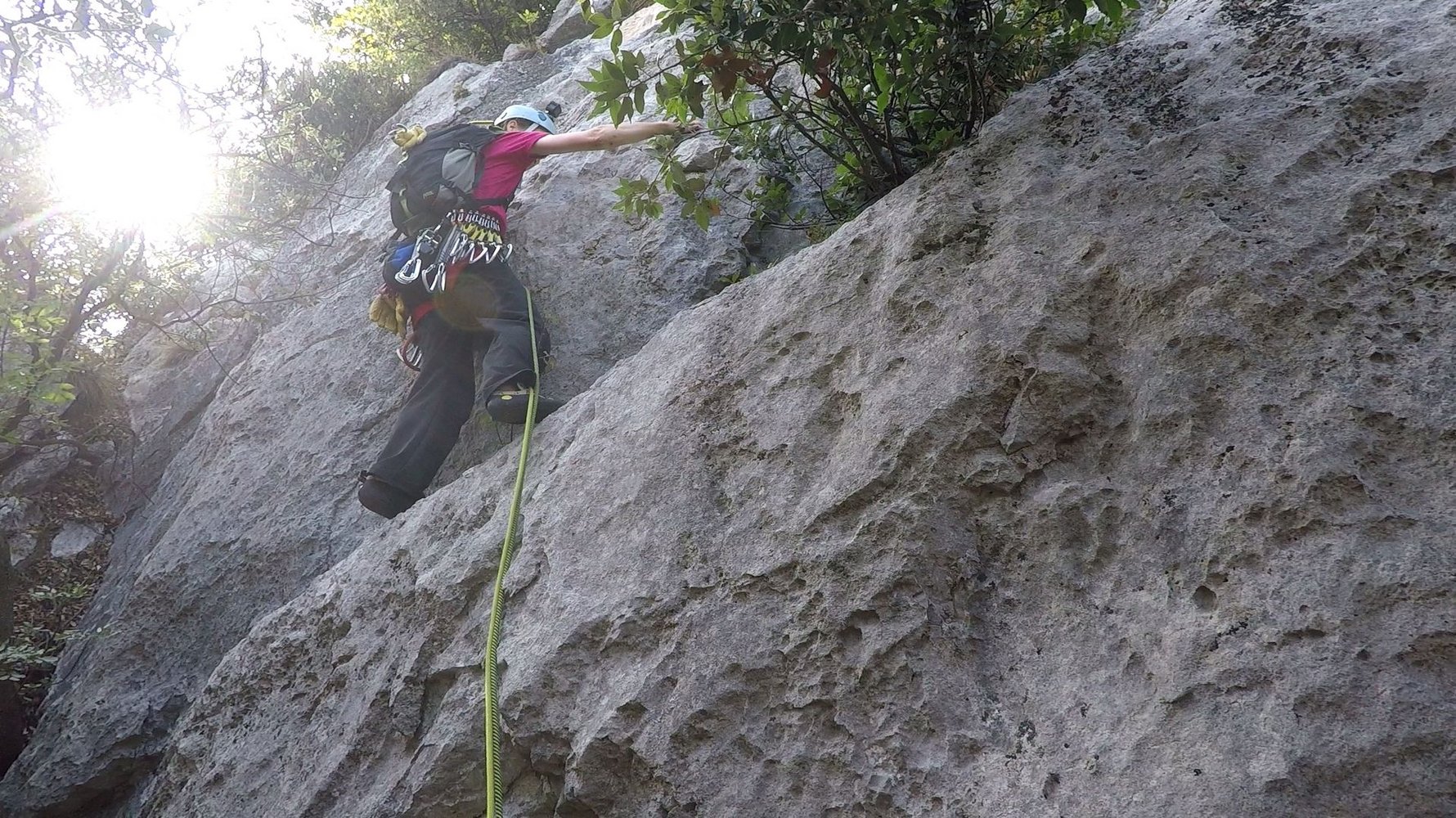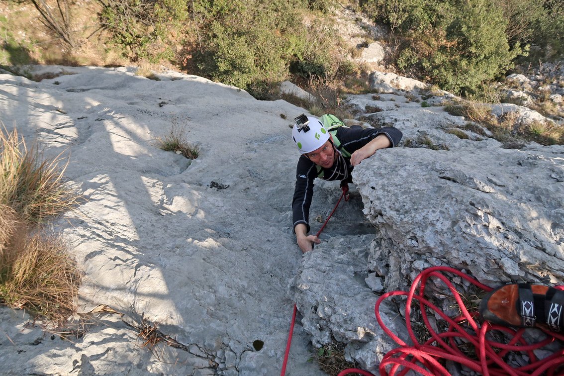 In der Seillänge vor der Schlüsselseillänge ist der Fels nicht ganz fest, es stecken aber wirklich viele Bohrhaken.
