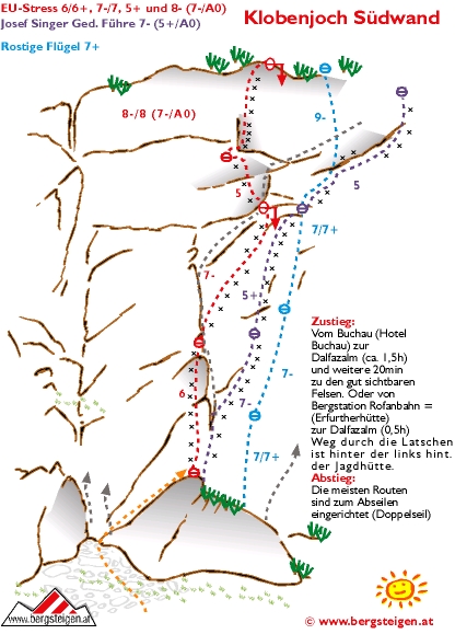Von Buchau in ca. 1,5 Stunden bis zur Dalvaz Alm und von dort in ca. 20 Minuten, linkshaltend an einer Jagdhütte vorbei, bis zu den gut sichtbaren Felsen (bester Weg durch die Latschen direkt hinter der Jagdhütte - dann der Wand entlang). Der Weg beginnt hinter dem "Hotel Buchau" und ist gut markiert.