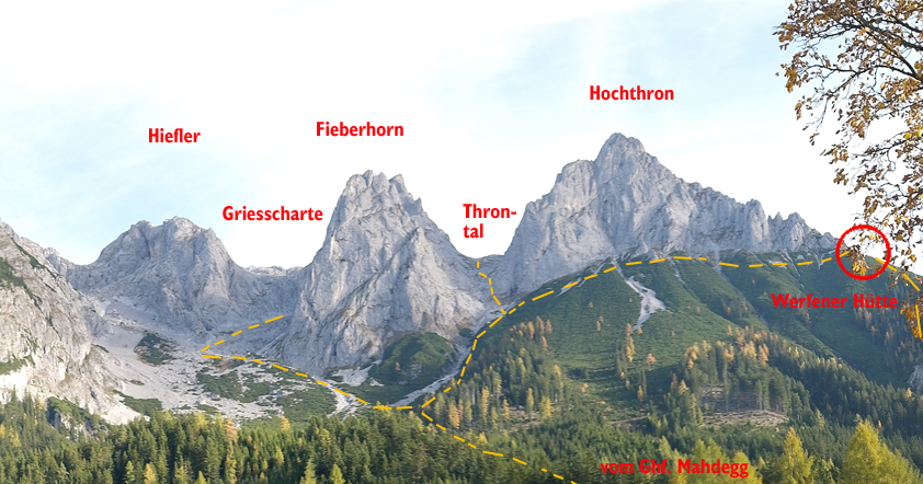 Vom Ausstieg weiter Richtung Gipfel und von dort zum markierten Steig, der vom Raucheck kommt. Dann weiter über die Griesscharte zurück zum Einstieg. Von dort auf dem Zustiegsweg zurück zum Ghf. Mahdegg. Zur Werfener Hütte steigt man besser über die Thronleiter ab (ein Tal weiter südlich zwischen Fieberhorn und Hochthron).