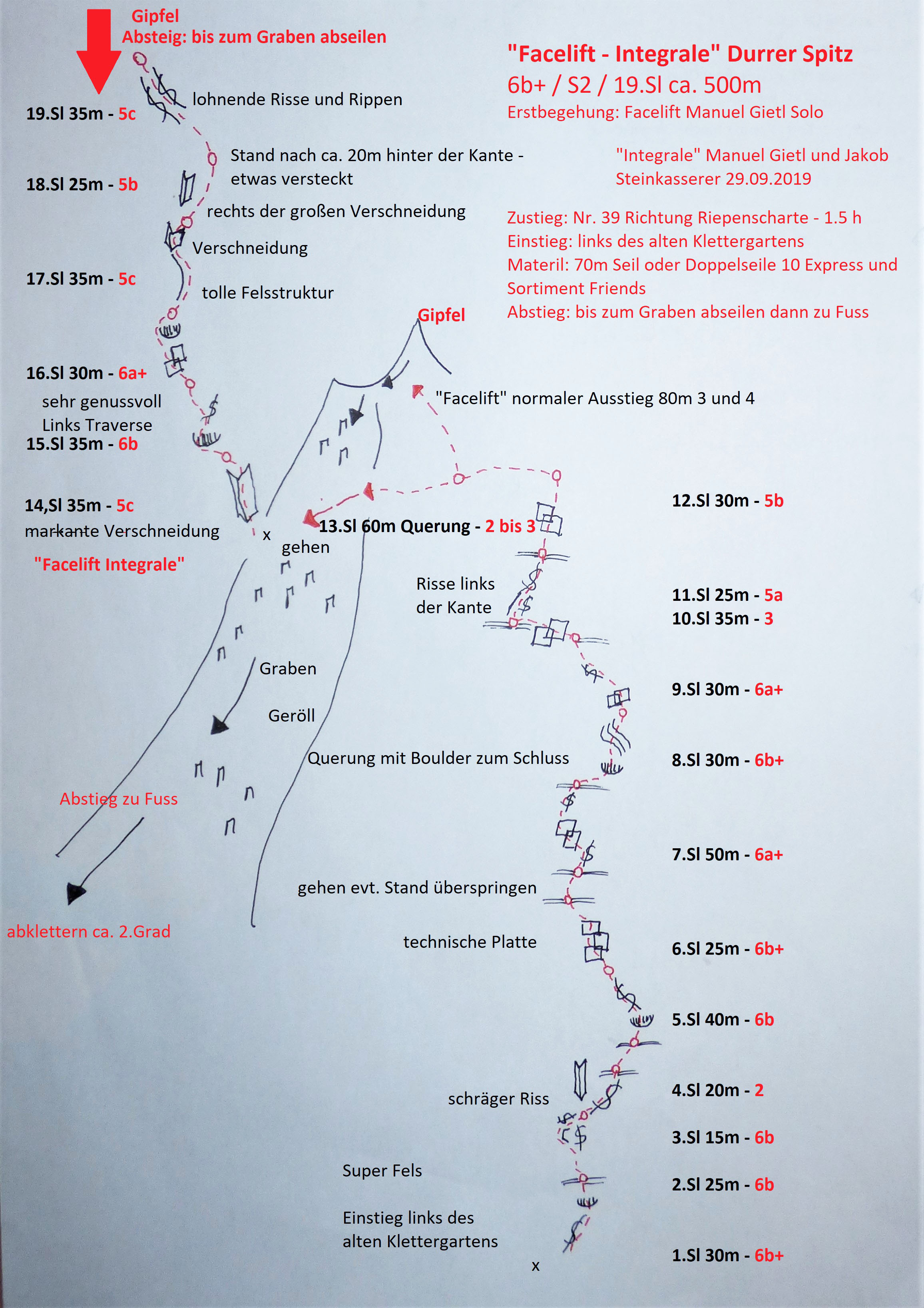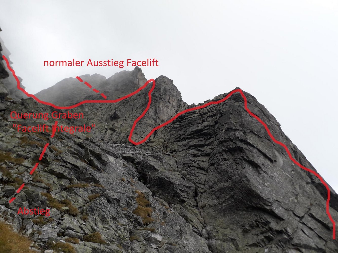 Bei der "Facelift" handelt es sich um sehr lohnende Kletterei in allerfeinsten Rieserferner Tonalit. Länge, Ambiente und Fels versprechen einen ausgefüllten Klettertag. Nachdem man den Zustieg nach ca. 1,5 geschafft hat, verpricht die Route genussvolles Höhersteigen entlang von sehr kompakten Platten und Rissen. Die Absicherung erfolgt über gebohrte Stand- und Zwischenhaken. Einige Passagen können mittels Friends problemlos entschärft werden. Der große Geröllgraben ermöglicht nach der 6. und eventuell 10. Seillänge einen recht unkomplizierten Rückzug zu Fuss. Der normale Ausstieg der Route verläuft sich nach der 12. Sl in Richtung Norden (3er Gelände) auf einen der Vorgipfel der Durrer Spitze. Überaus empfehlenswert ist der Ausstieg über die "Facelift - Integrale", die Manuel Gietl am 29.09. gemeinsam mit Jakbo Steinkasserer einrichten konnte. Nach der 12. Seillänge quert man in Richtung Westen über den breiten Graben. Am Fuße einer markanten Verschneidung kommt man dann noch in den Genuss, 6. Seillängen zu klettern. Der beeindruckende Fels und die eindrucksvolle Umgebung am Kleinen Hochgall runden den hoffentlich gelungenen Klettertag ab.
