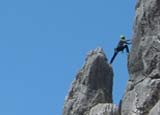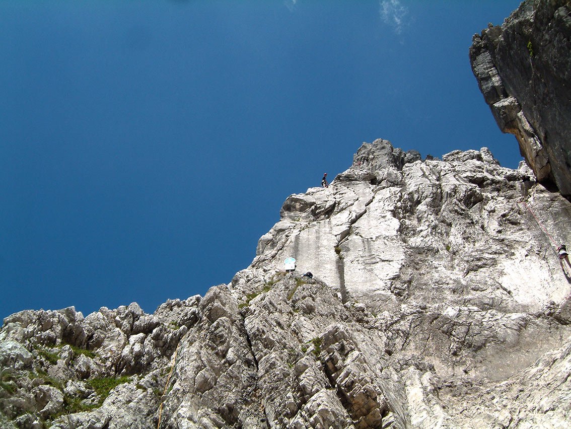 Vom BH auf einem flachen Schotterplatz noch ca. 150 m am Grat (1- 2, auch einzelne BH) zum unscheinbaren Gipfel. Von hier auf Steigspuren in eine Steilrinne (Stellen bis 1) hinab, vorbei an einem Felsenfenster zur 1. Abseilstelle. Nun 6 x 20 m hinab zum Einstieg.