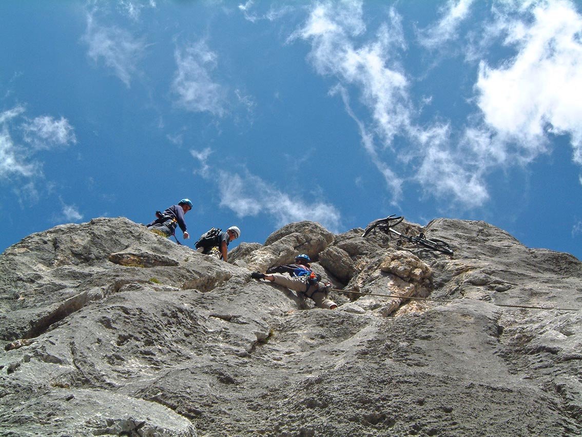 Die Fahrradlkant'n ist wohl der beliebteste Klassiker im Oberreintal. Die tolle Kante bietet neben festen Fels noch einige lustige Überraschungen, welche dann auch die Wartezeit - an schönen Tagen sind schon mal 25 Seilschaften an der Kante - verkürzen. Die Absicherung ist mit AV-Ringen an Ständen durchaus alpin, an den schweren Stellen jedoch gut. Die leichten Seillängen haben keine Zwischensicherungen. Klemmkeile, Köpfelschlingen und Friends können gut gelegt werden.